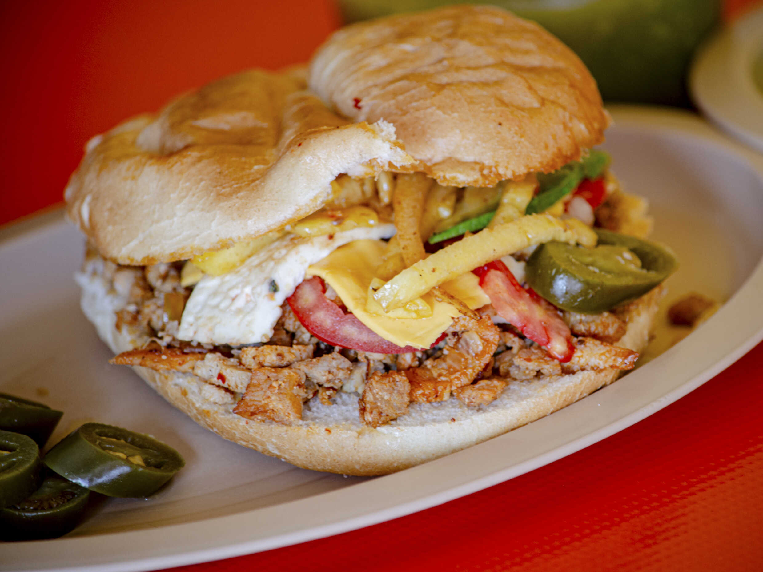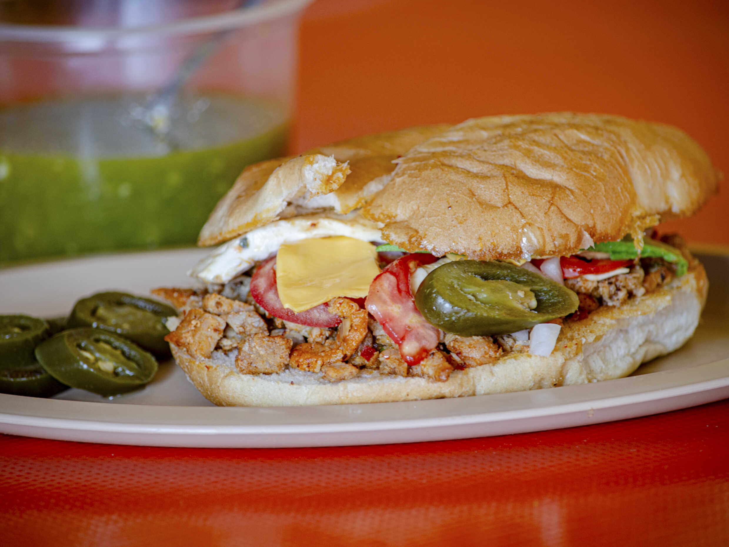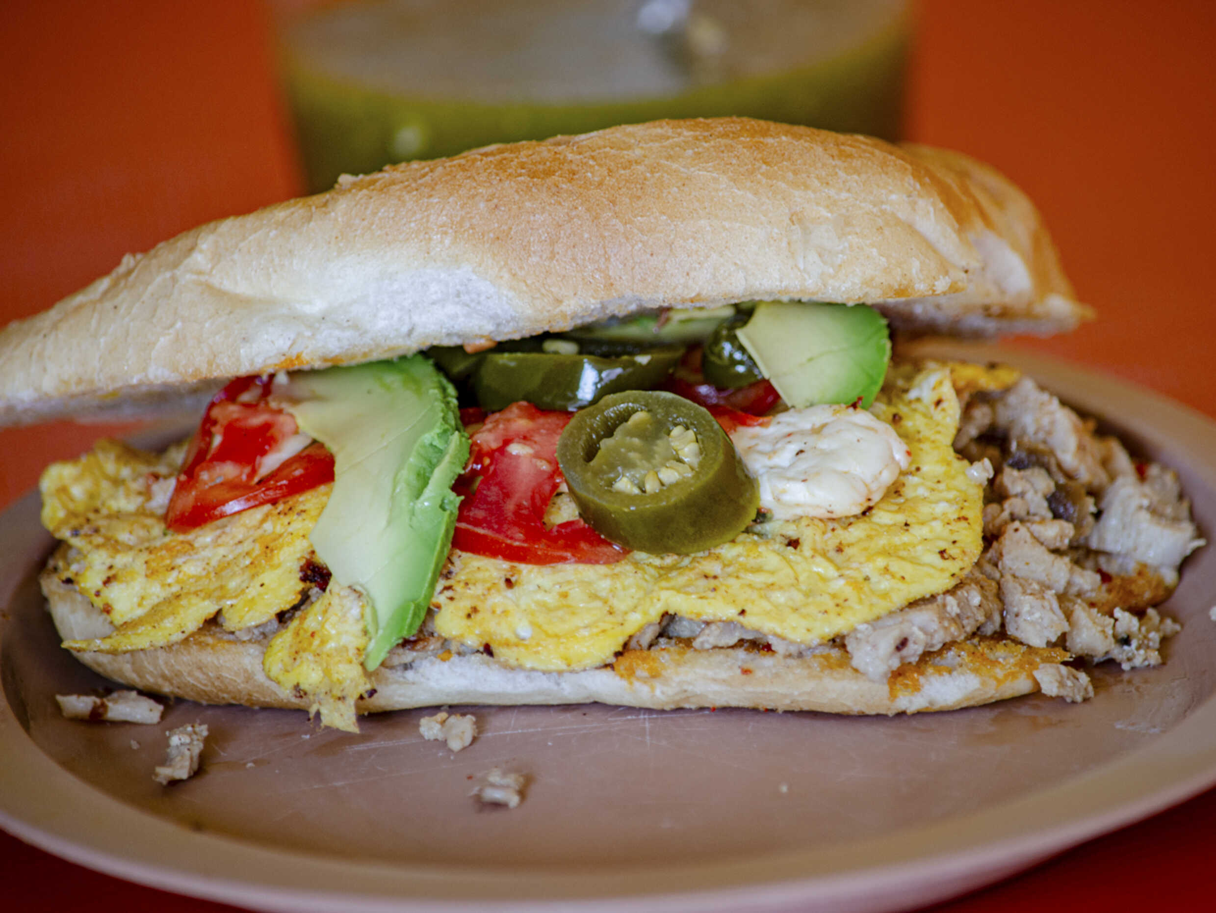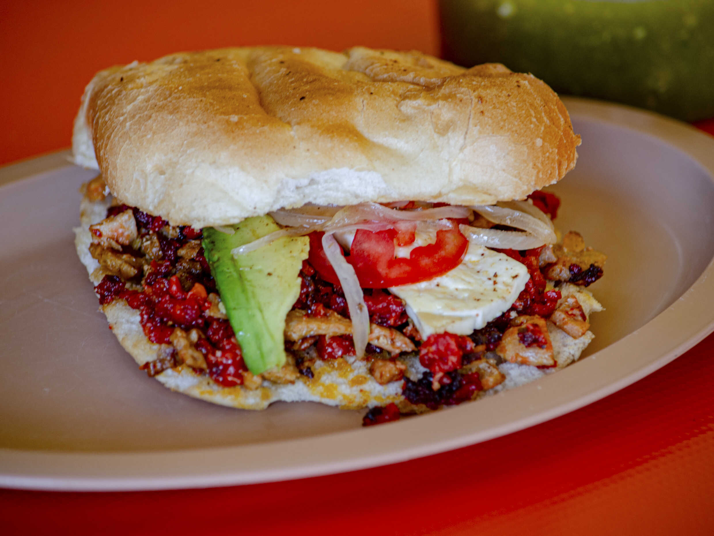Jamón, jitomate, cebolla, chiles en vinagre y aguacate.