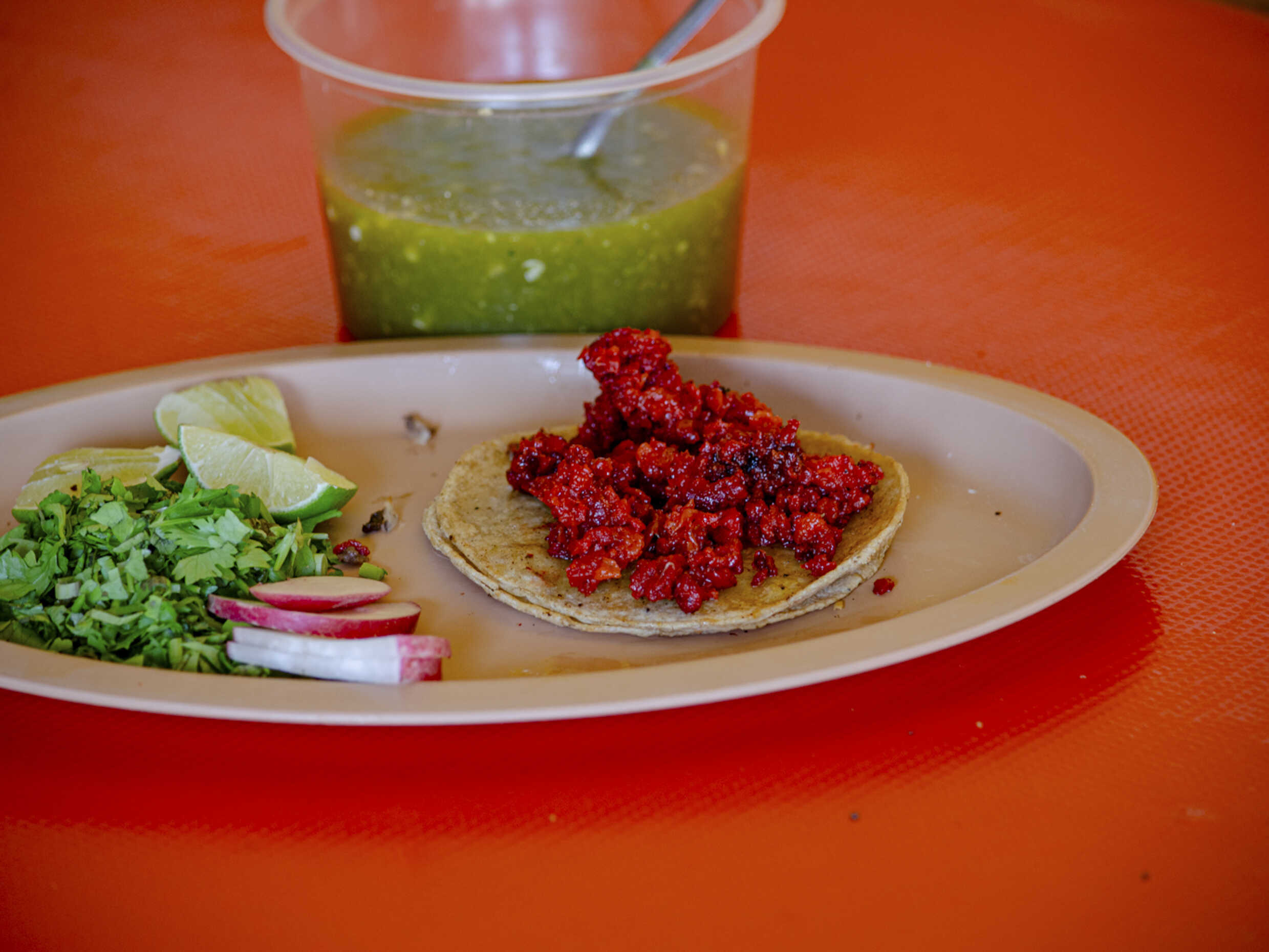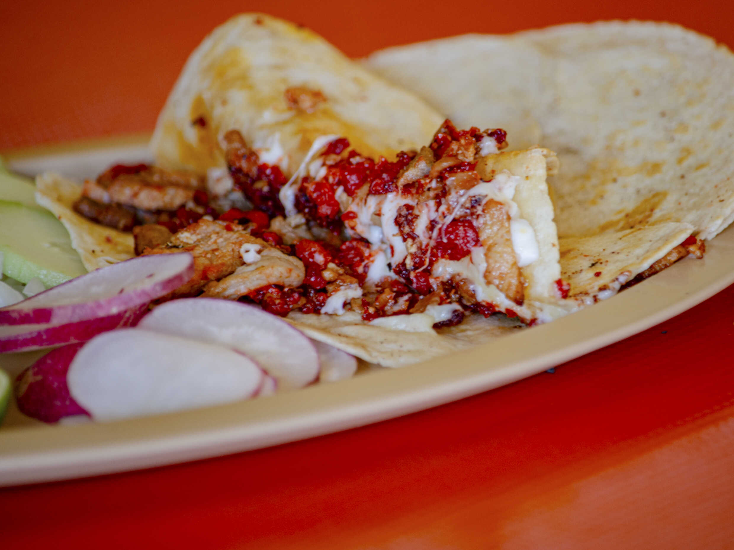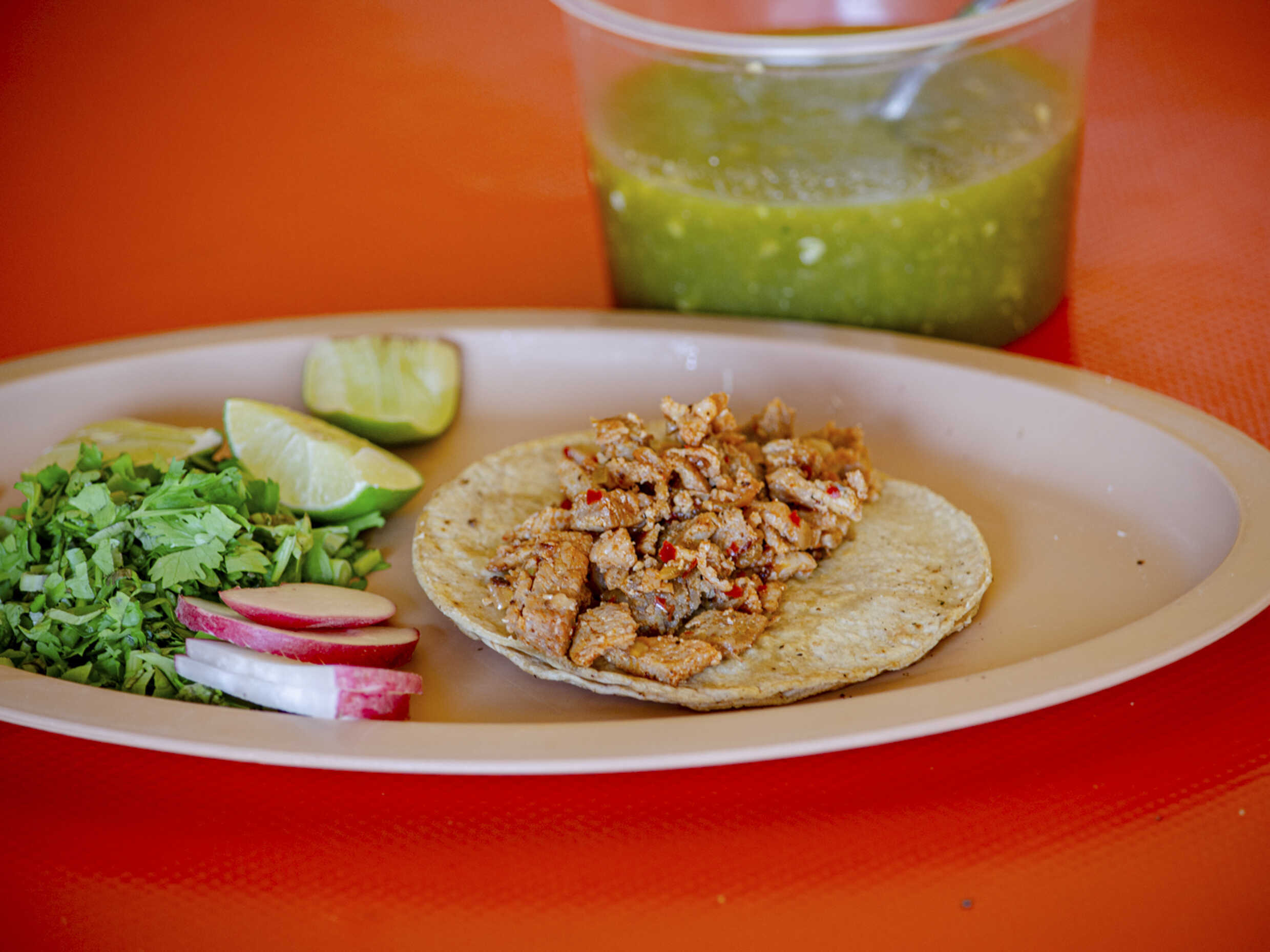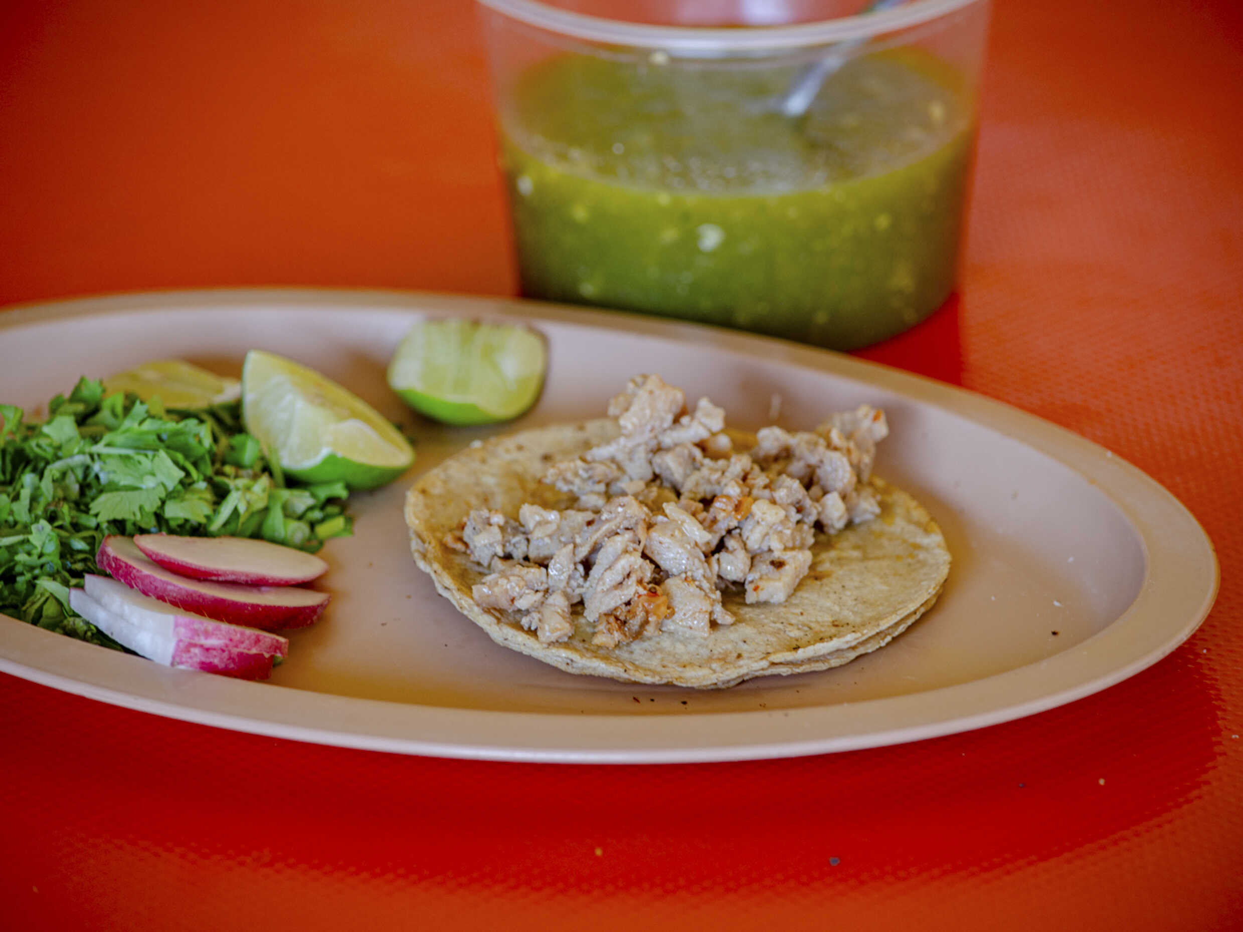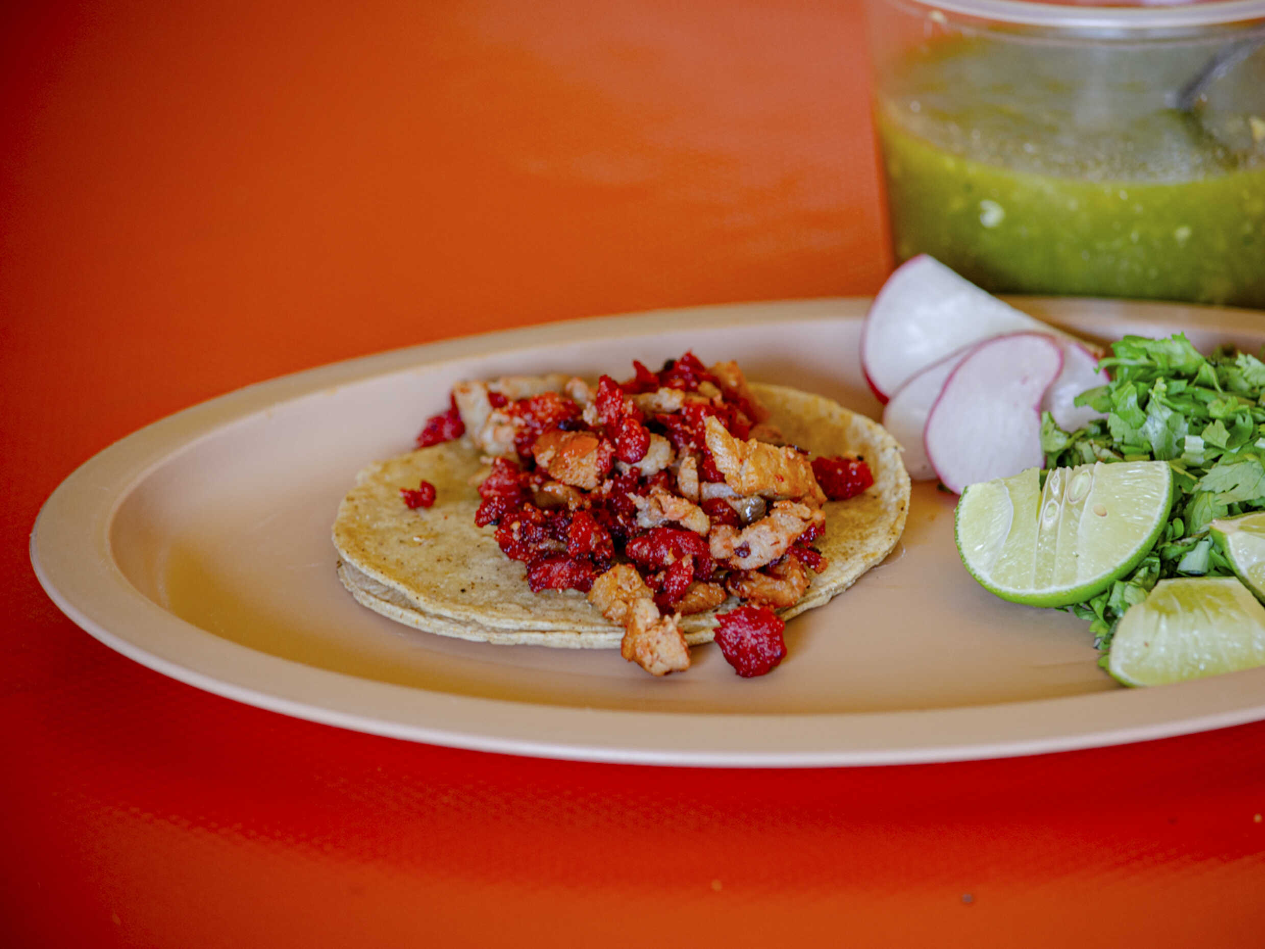 Taco de pastor, costilla y chorizo, doble tortilla, acompañados de cilantro, salsa, limones, rábano y pepino.