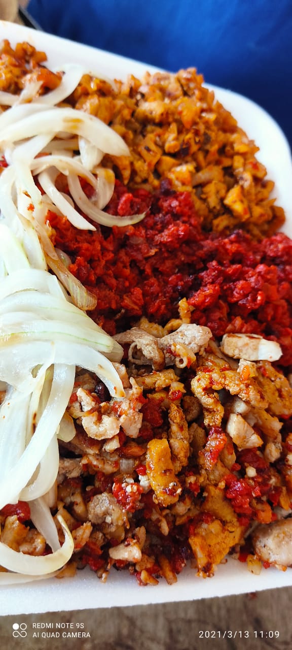 Es una deliciosa mezcla de costilla, pastor y chorizo, acompañada de cebollita asada, cebolla, cilantro, pepino, rábano, limones y salsa bien picosita.