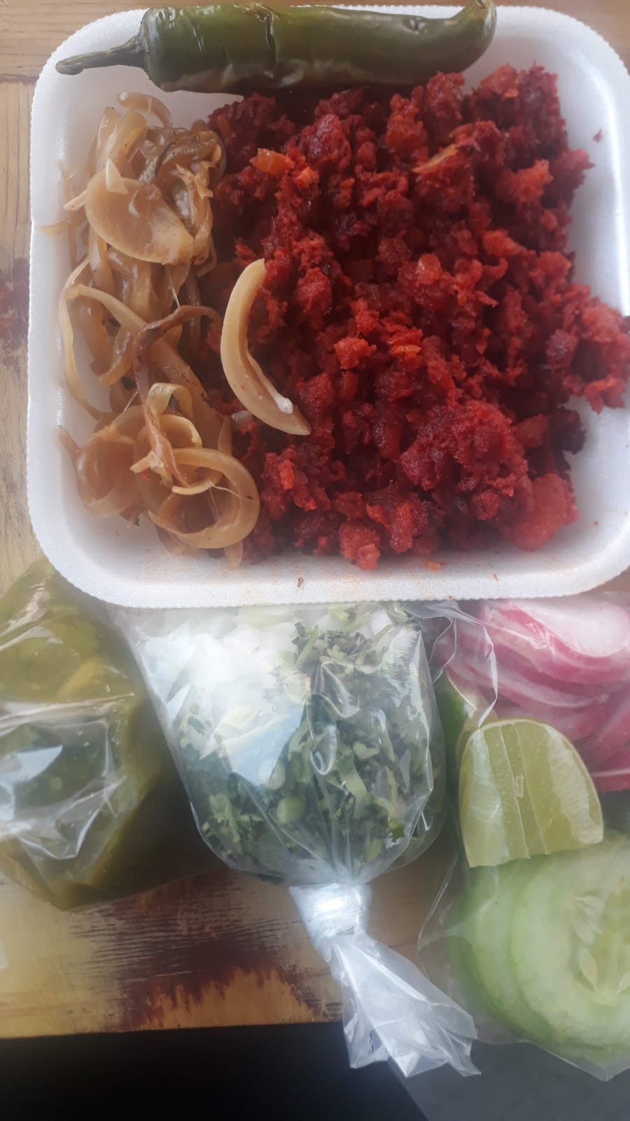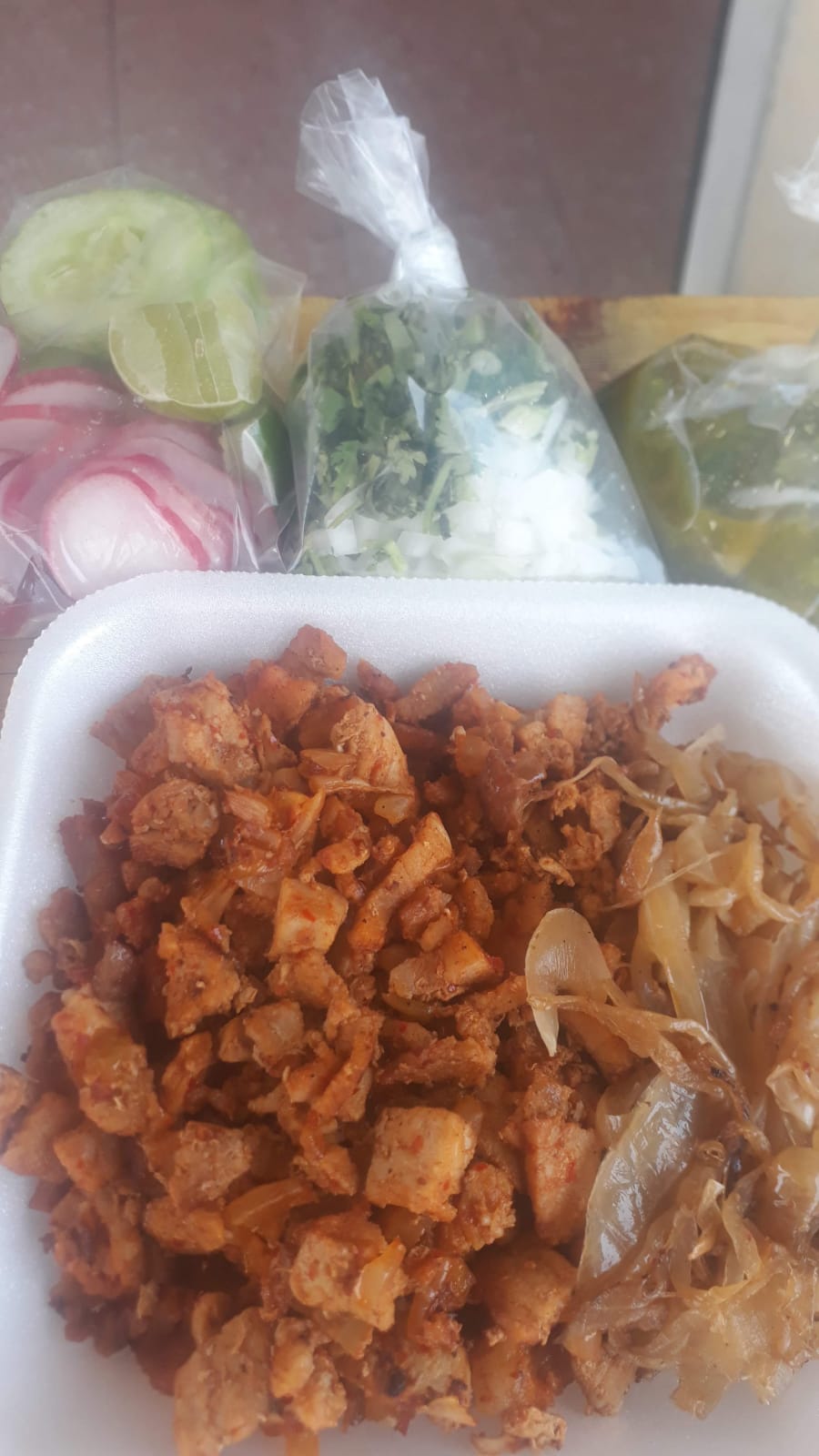 Acompañada de cebolla, cilantro, rábano, pepino, limones y salsa.