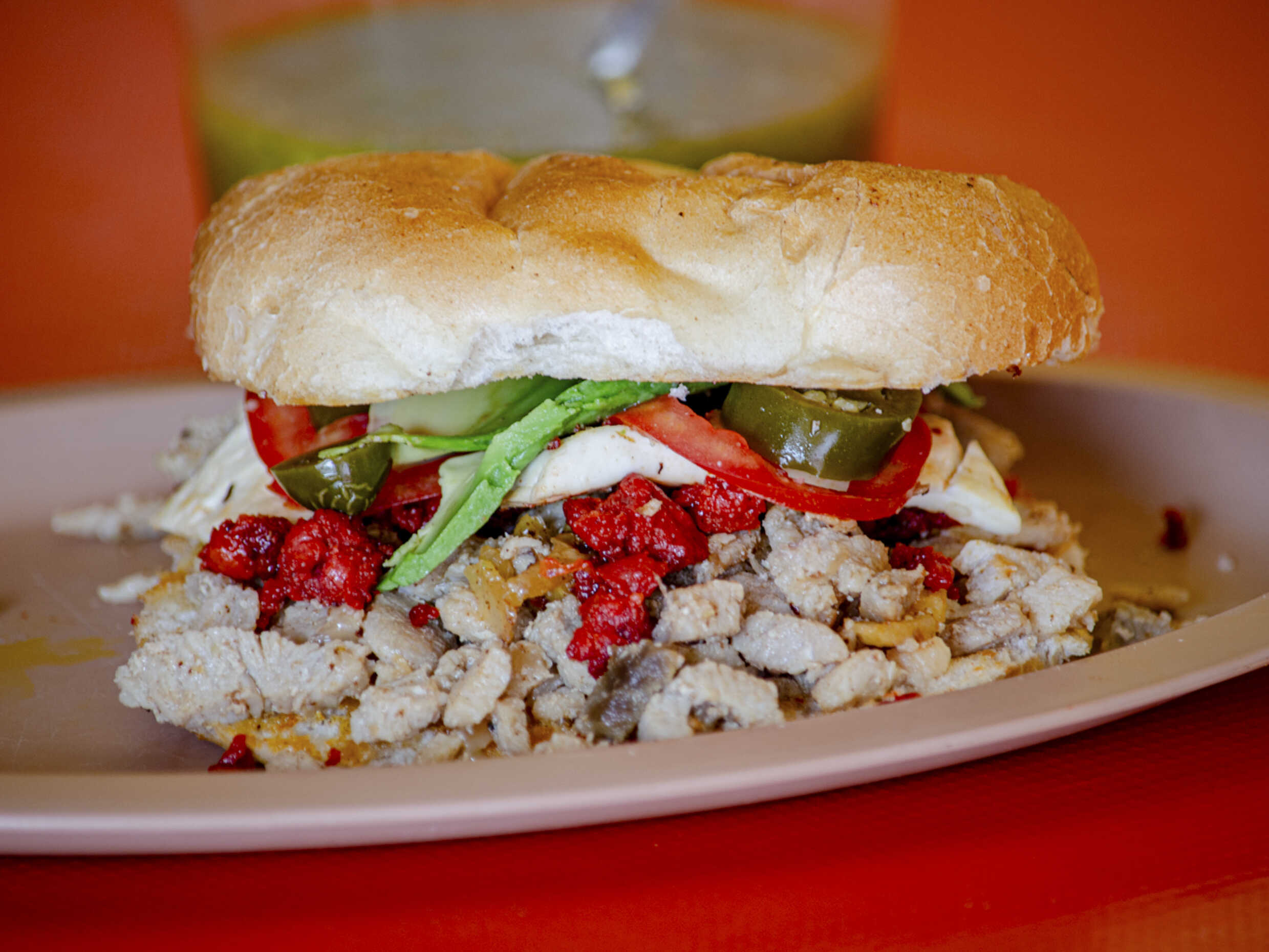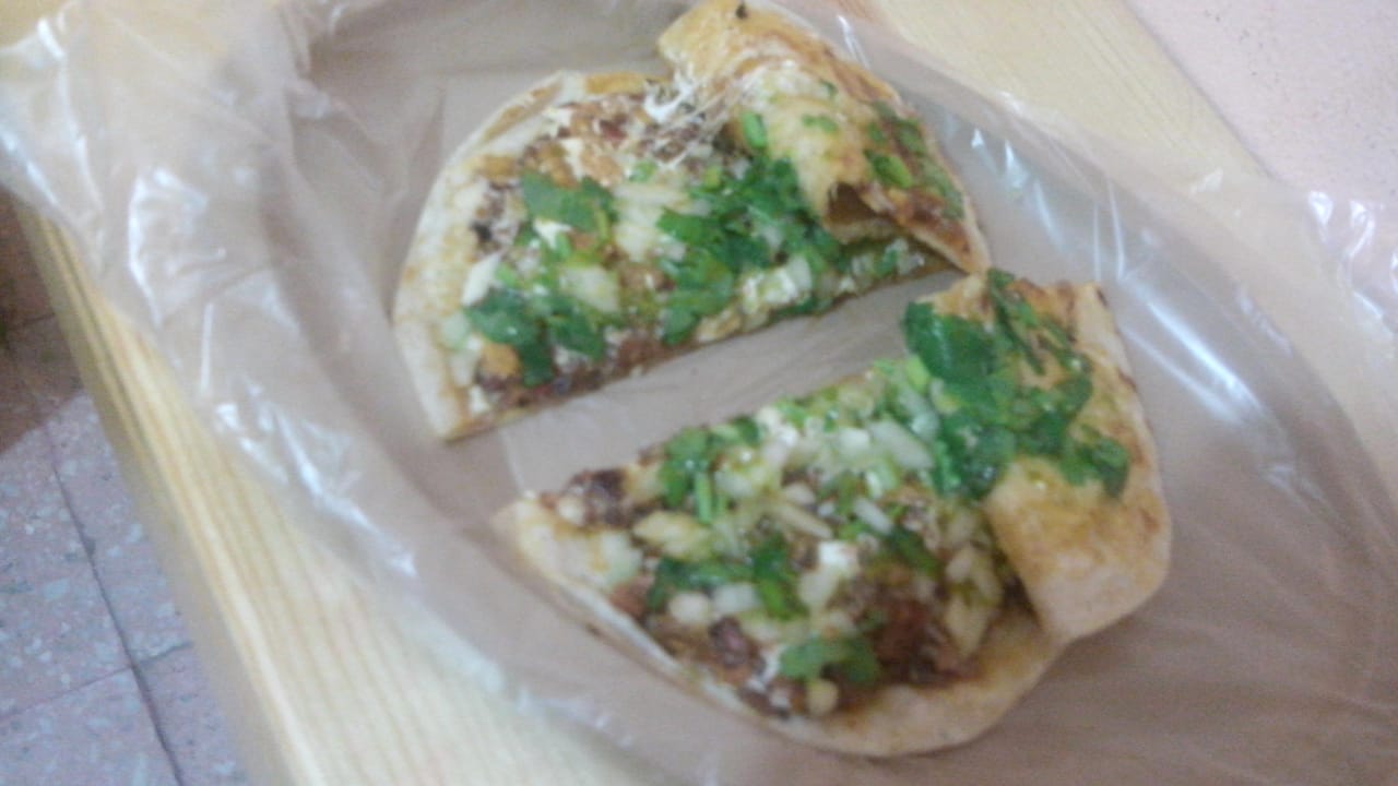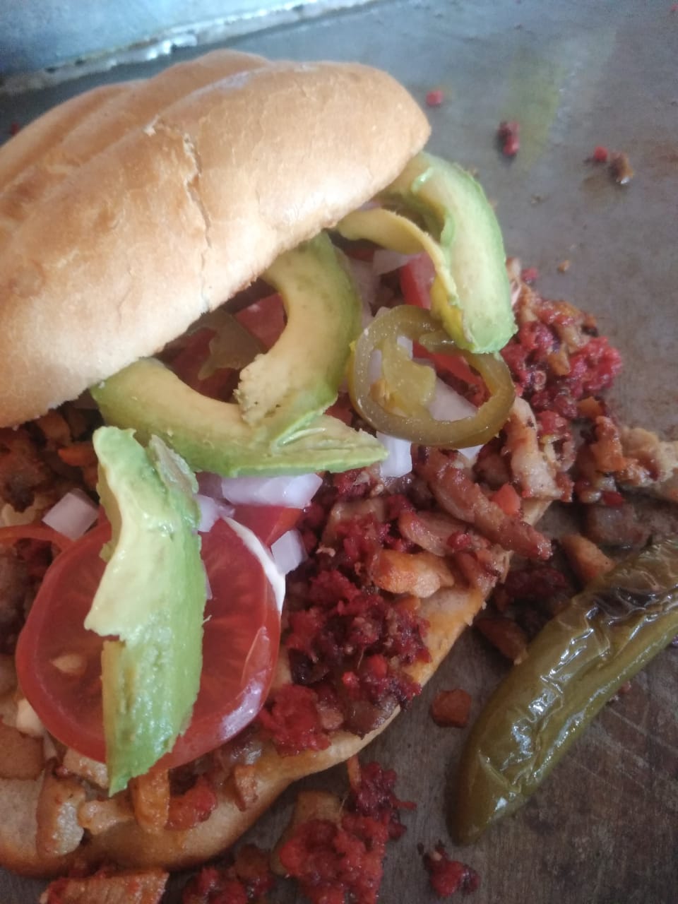 Exquisita combinación de pastor,chorizo, huevo y queso panela, sazonada con jitomate, cebolla, aguacate y jalapeños