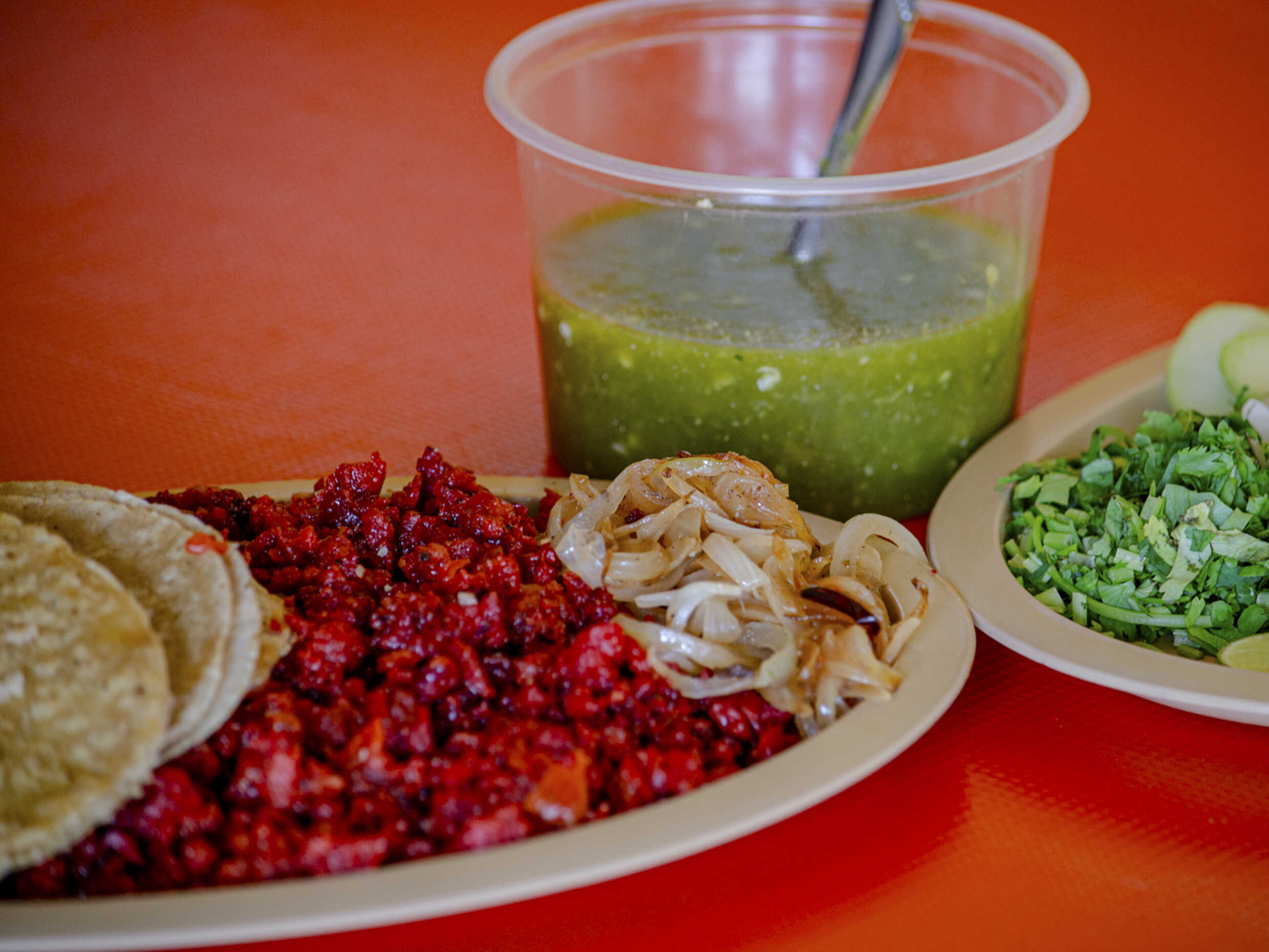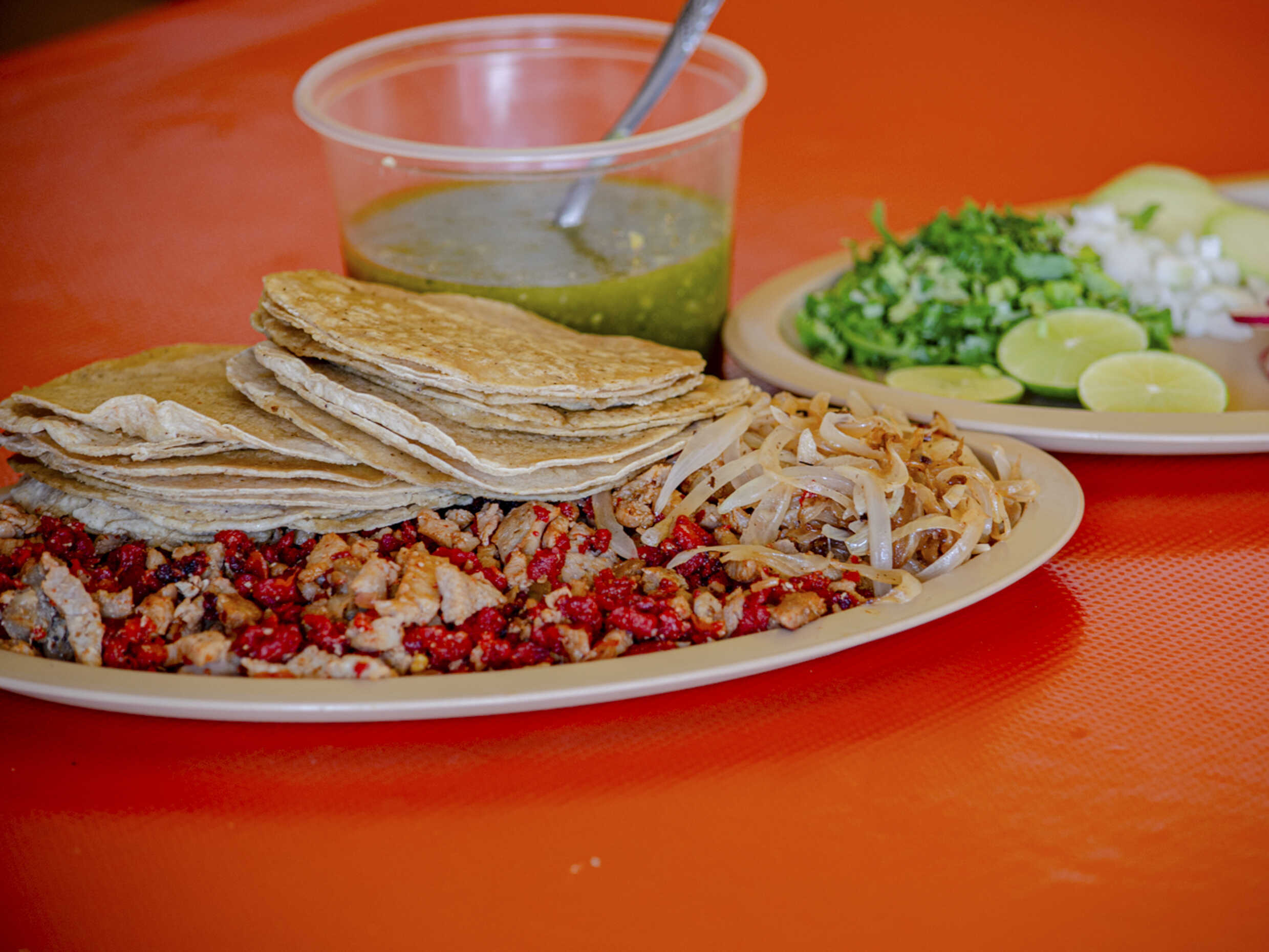 Deliciosa costilla marinada, con tortillas de maíz, acompañada de cebolla, cilantro, rábano, pepino, limón, cebolla asada y picosita salsa verde