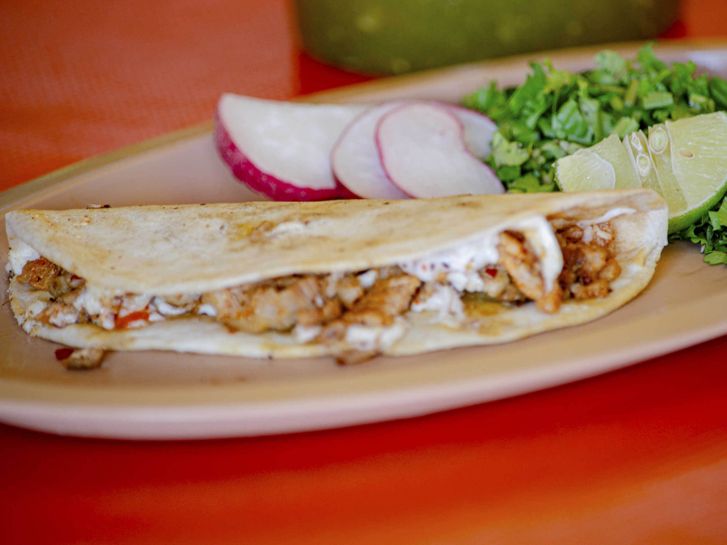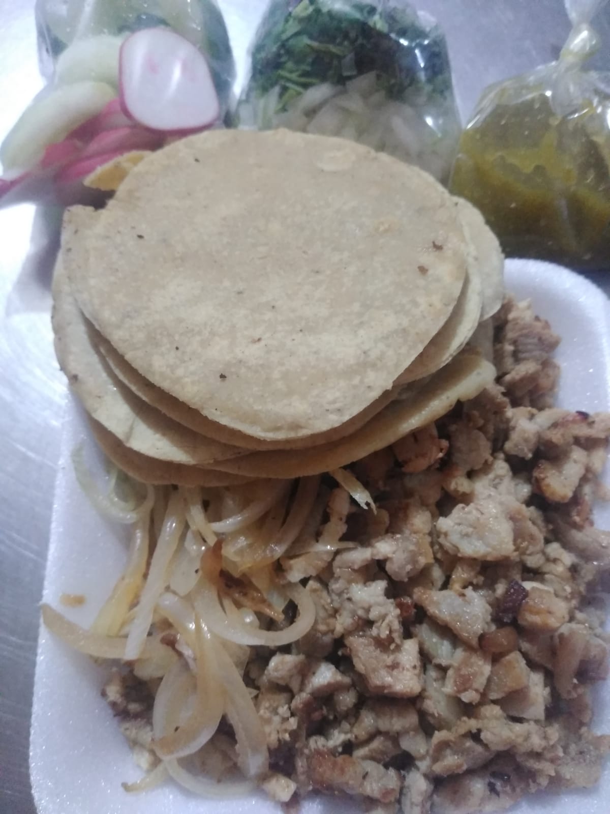 Acompañada de cebolla, cilantro, pepino, rábano, limón y salsa.