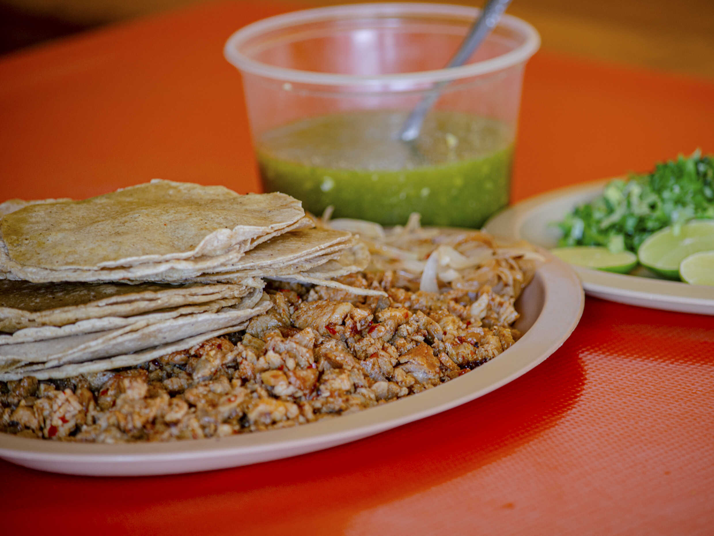 Tacos de costilla de cerdo, doble tortilla, acompañados de cilantro, salsa, limones, rábano y pepino.