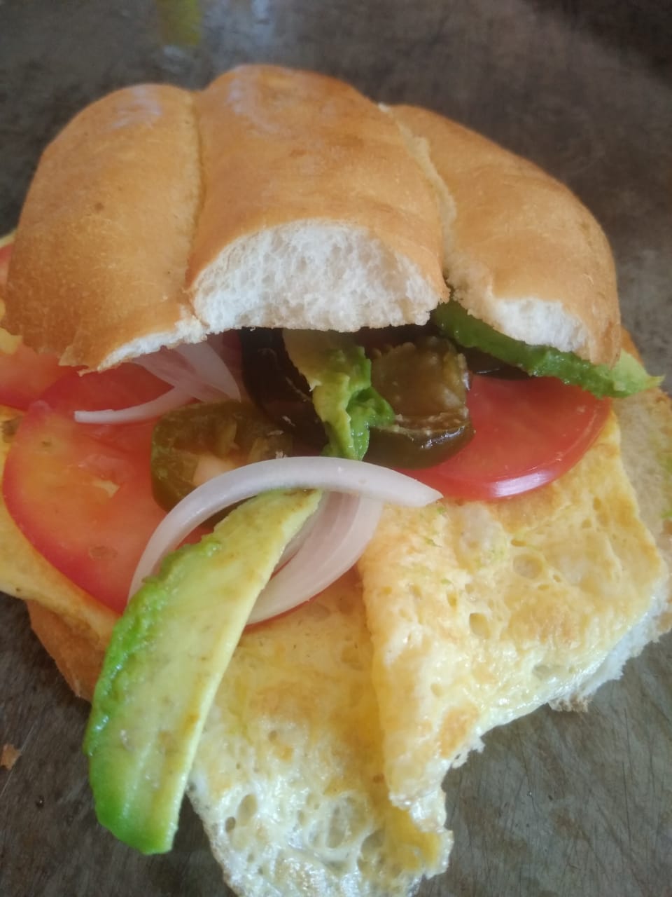 Huevo, jitomate, cebolla, chiles en vinagre y aguacate.