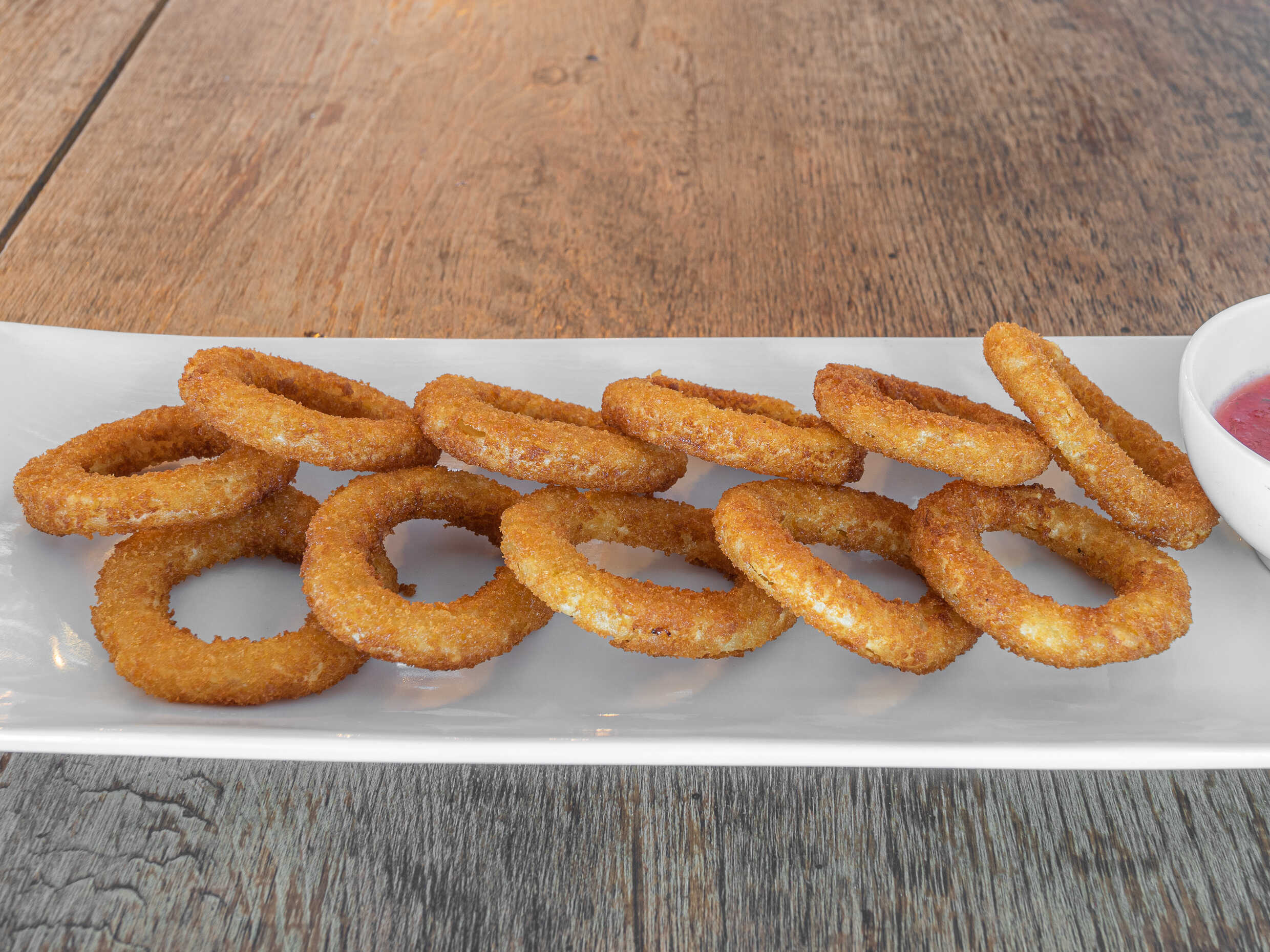 Servicio de once aros de cebolla fritos, cubiertos de un gustoso empanizado, acompañados con salsa de la casa.