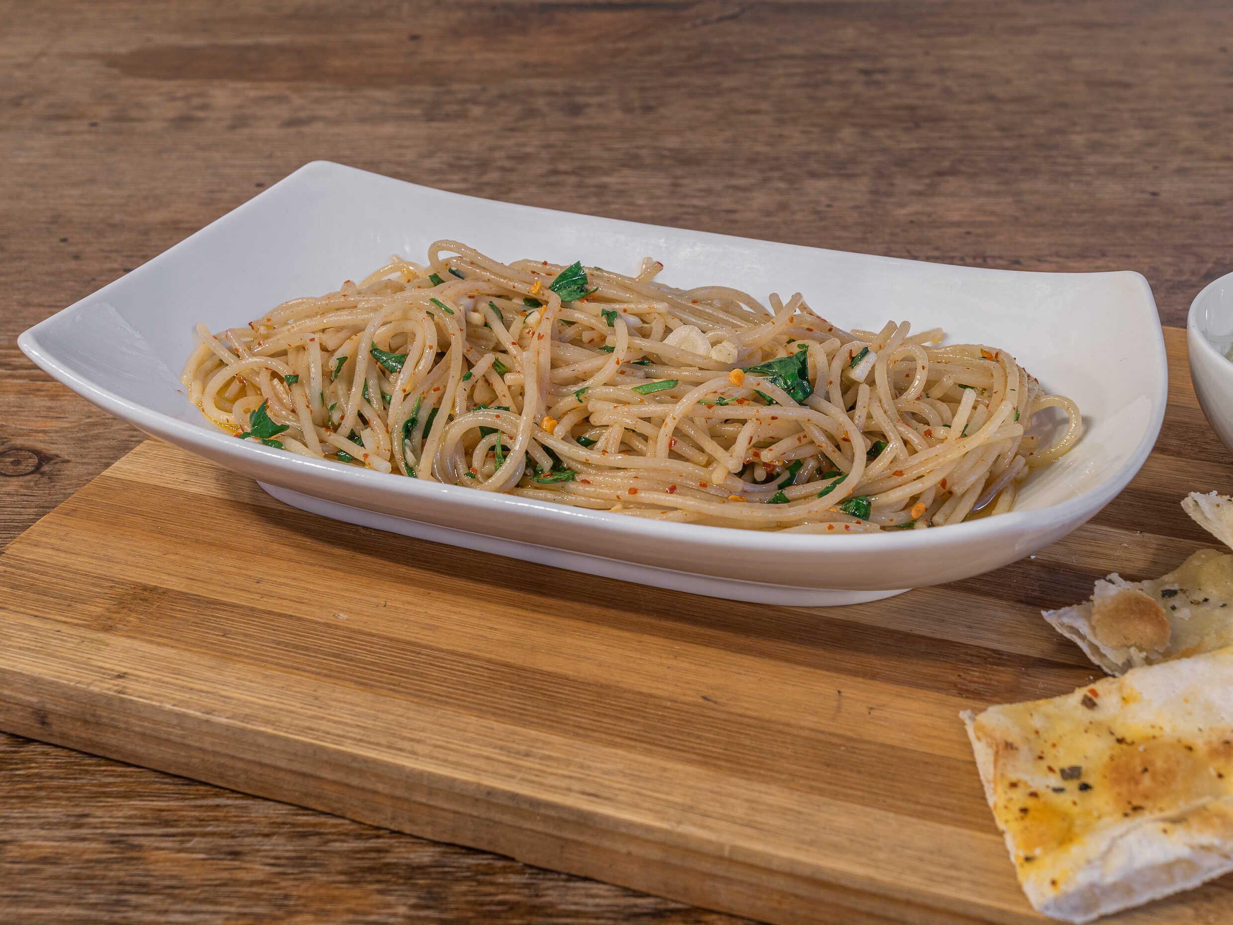 Pasta larga con aceite de oliva ajo perejil y un toque de chile molido acompañado de pan y queso parmesano.