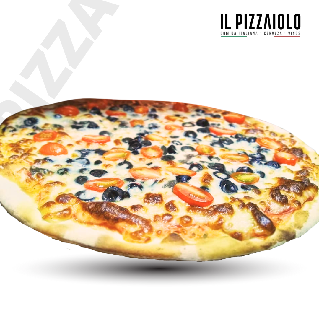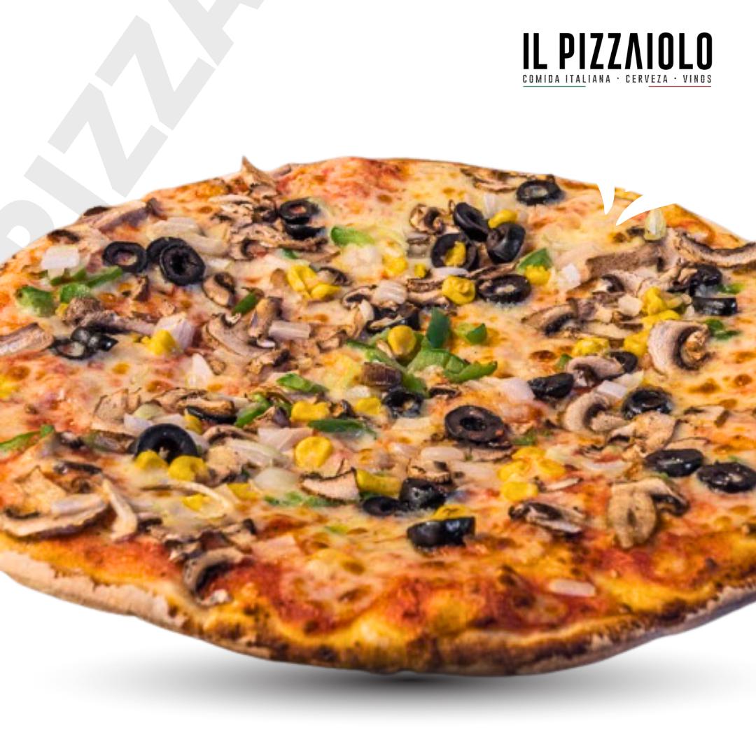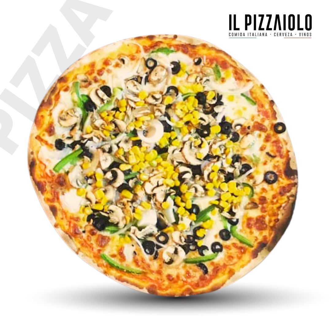 Salsa, queso mozzarella, aceitunas negras, cebollas, pimiento verde, hongosy maíz. Pizza de 33 cm de masa delgada al estilo artesanal horneadas a la leña.