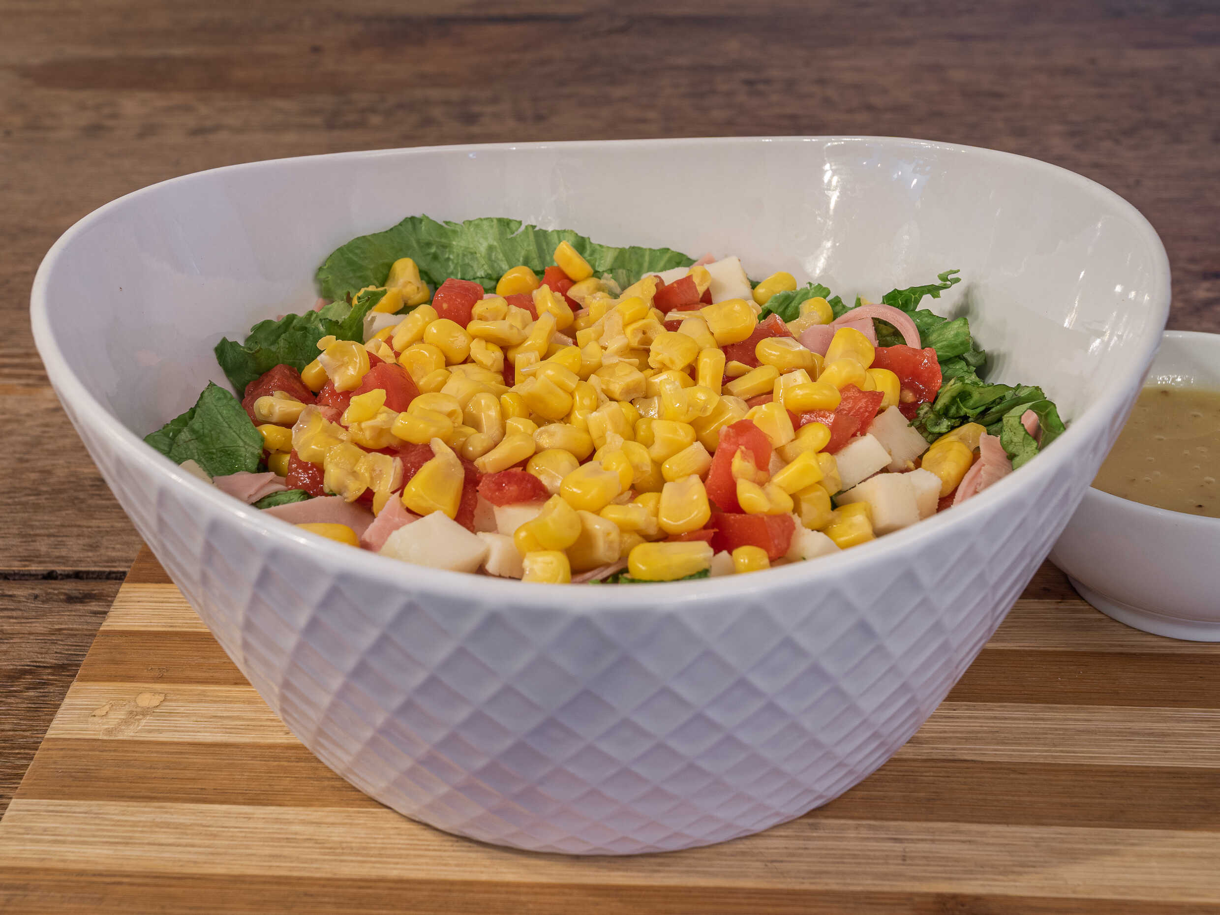 Lechuga, jamón de pierna, jitomate picado, maíz, trozos de queso, pollo y aderezo miel mostaza.
