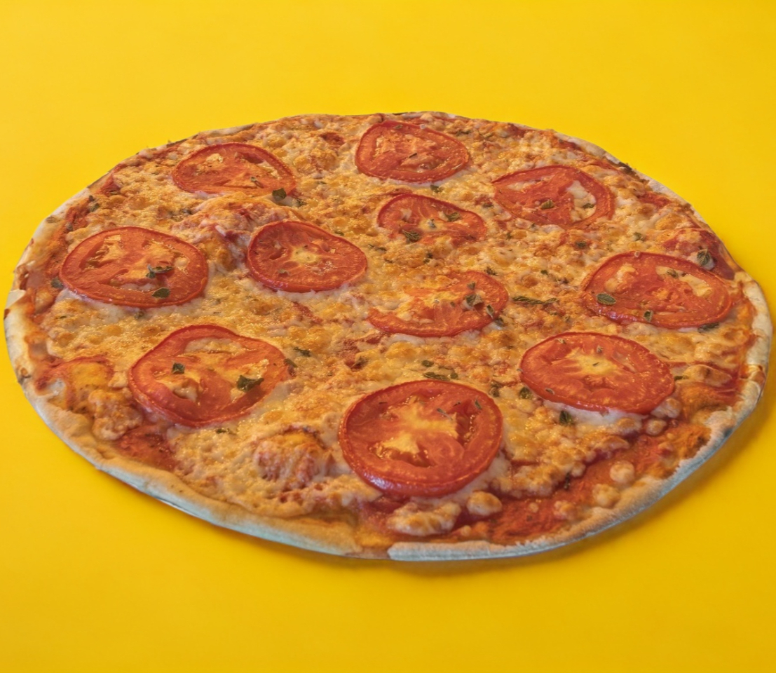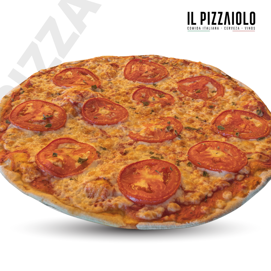 Pizza con salsa, queso, jitomates y un toque de orégano. Pizzas de 33 cm artesanales hechas en horno a la leña.