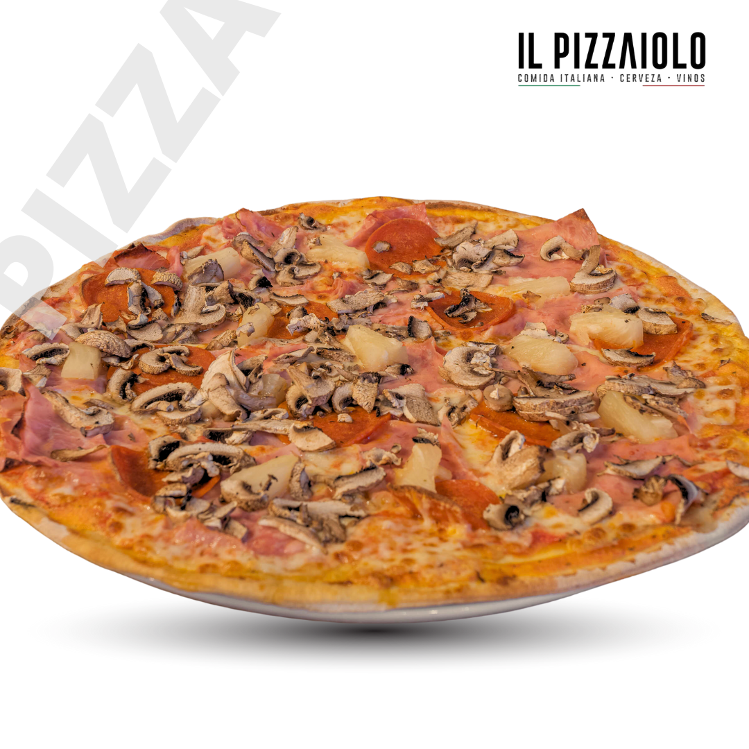 Salsa, queso mozzarella, jamón, pepperoni, piña en trozos y hongos. Pizza de 33 cm de masa delgada al estilo artesanal horneadas a la leña.