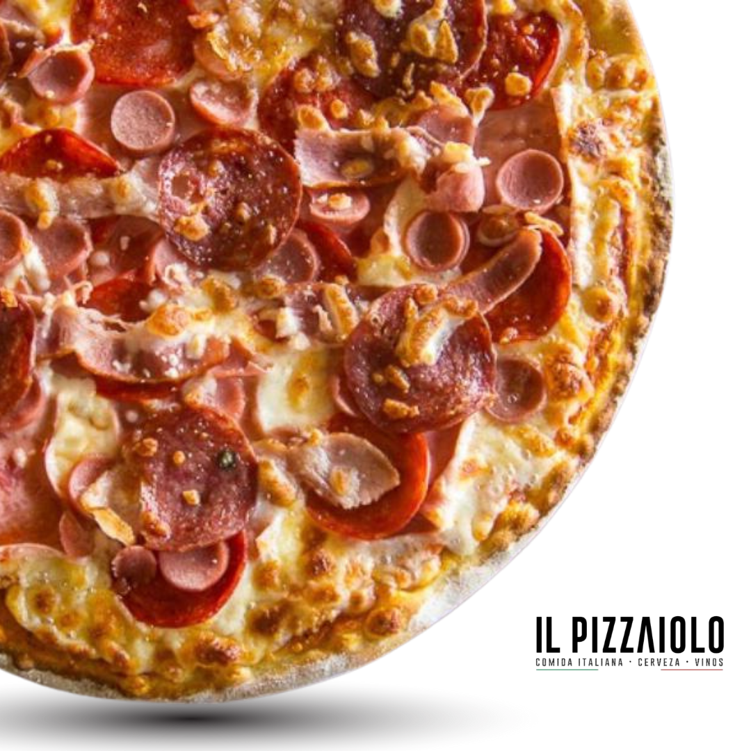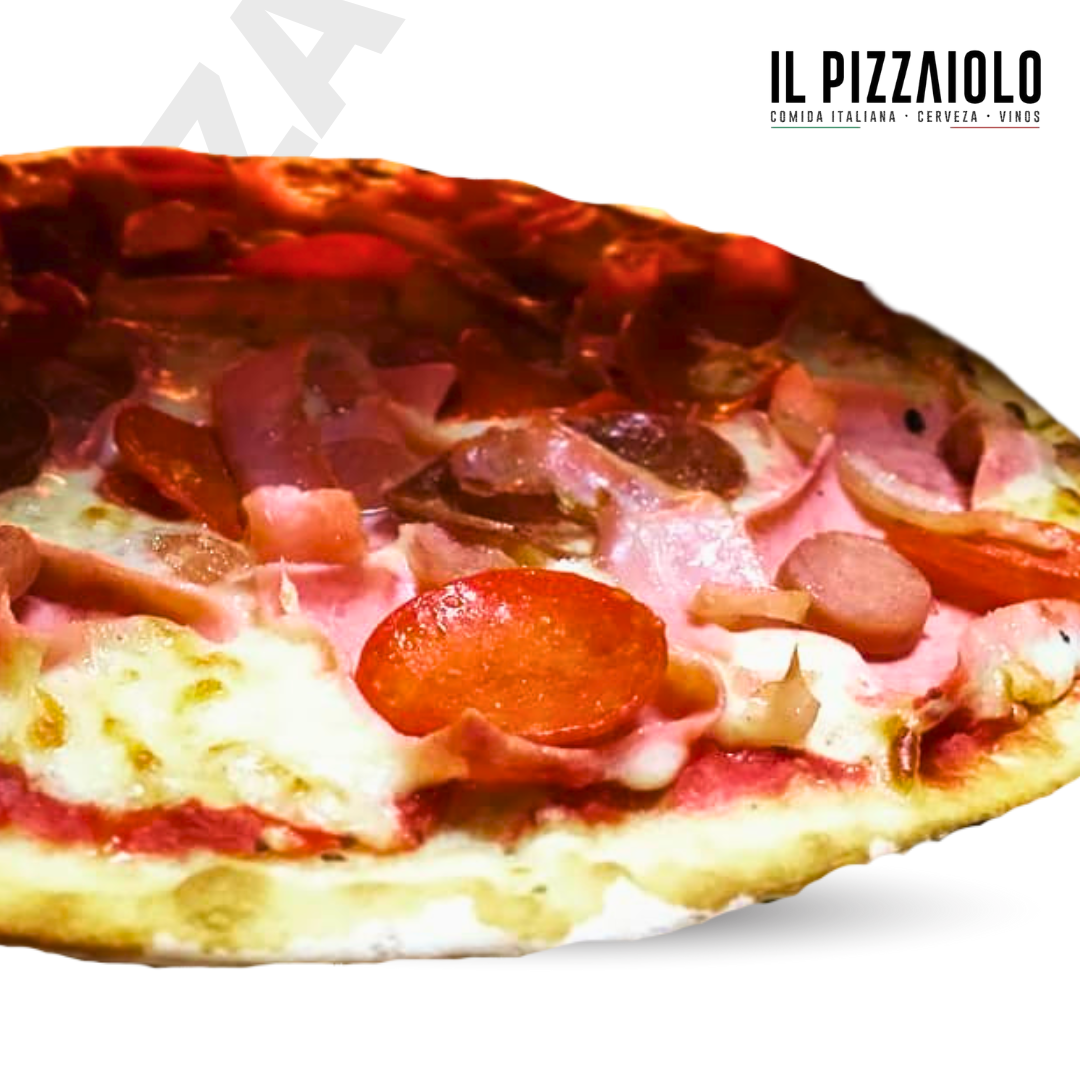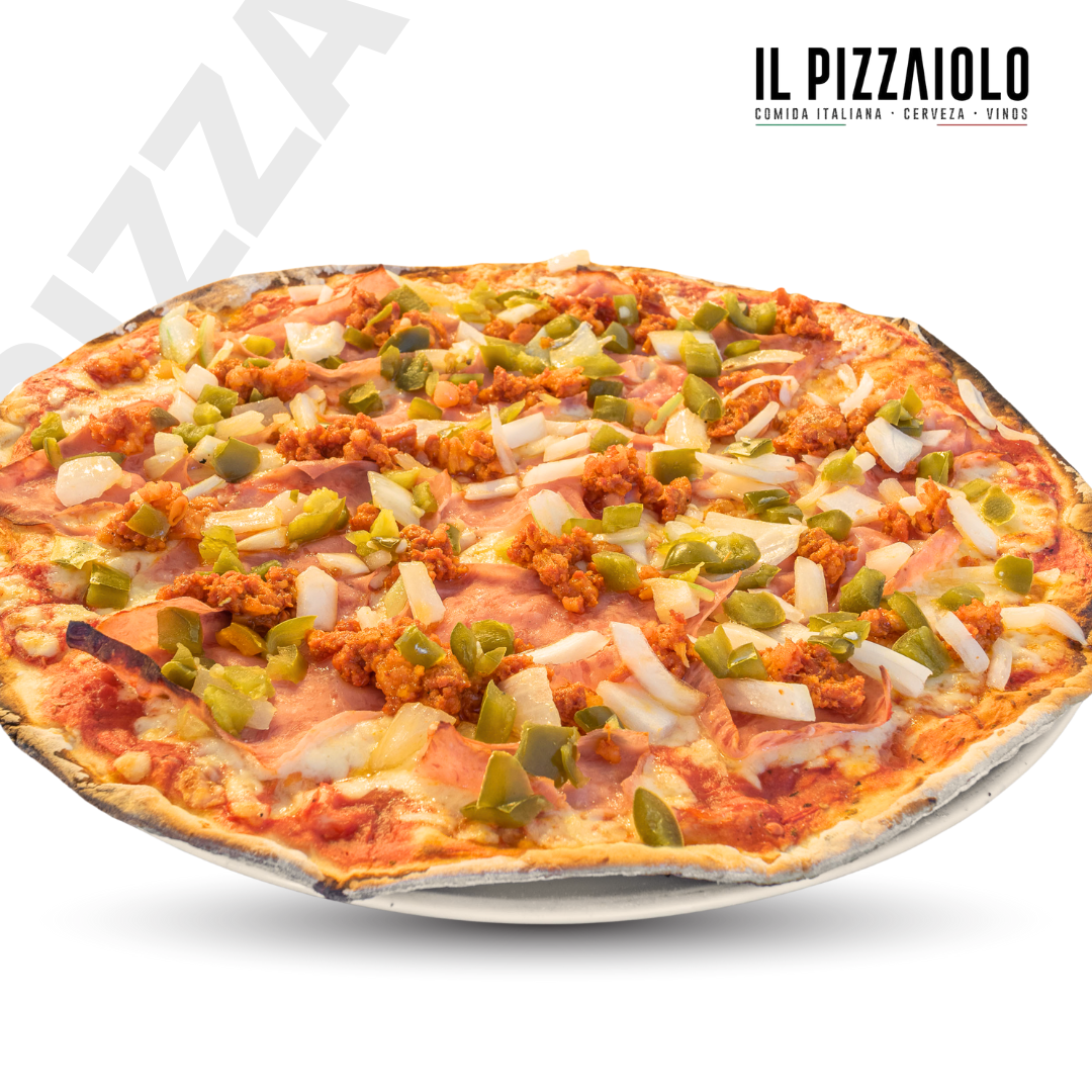 Pizza con salsa, queso, jamón, pepperoni y chorizo. Pizzas de 33 cm artesanales hechas en horno a la leña.