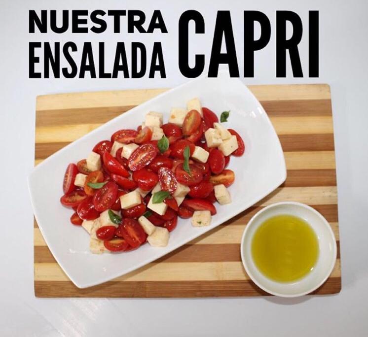 Ensalada capri con tomate cherry, queso mozzarella, aceite de oliva, sal y pimienta. Esta ensalada no trae lechugas.