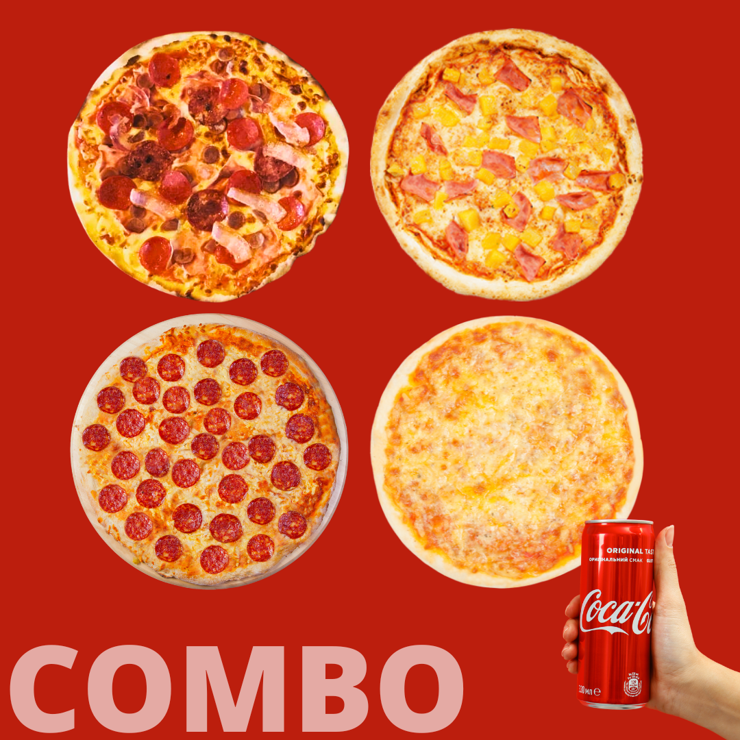 Pizza Bomba*1 + Pizza 4 Quesos*1 + Pizza Hawaiana PROMO*1 + Pizza de Pepperoni PROMO*1 + Coca 355ml*1