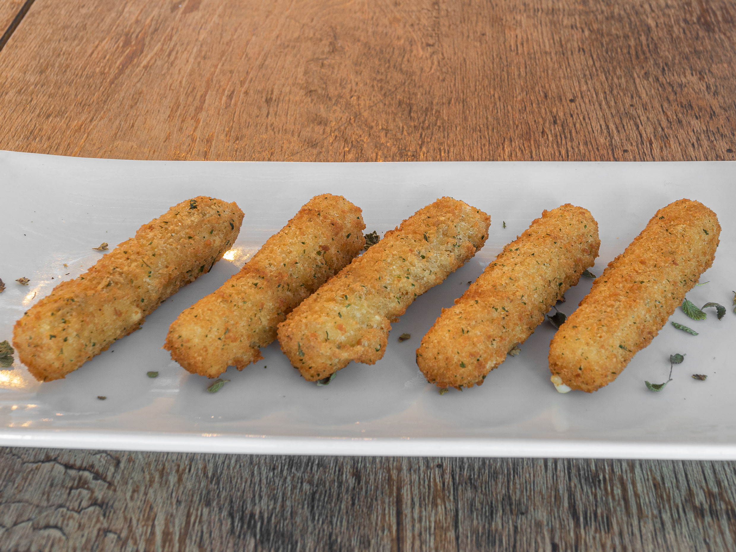 5 Palitos rellenos de queso mozzarella acompañados con salsa.