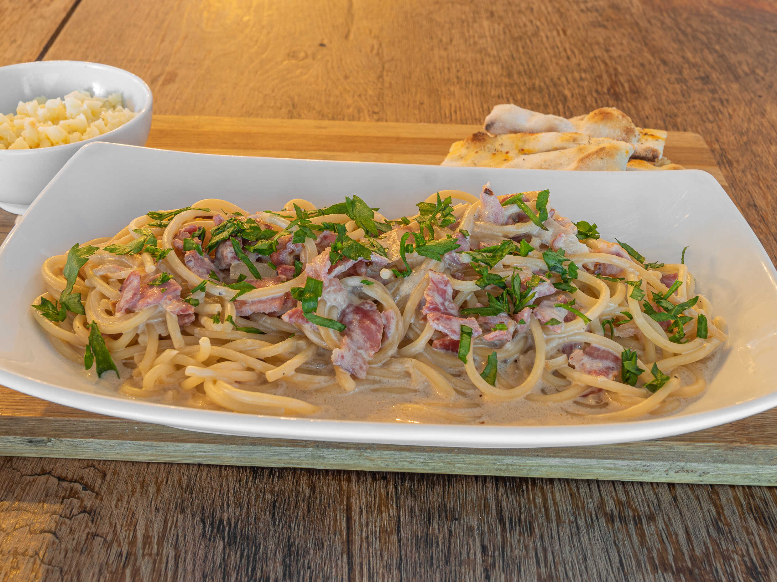 Pasta larga bañada en media crema, trocitos de tocino, cebolla sofreída y un toque de perejil finamente picado, acompañado de pan artesanal y queso parmesano.