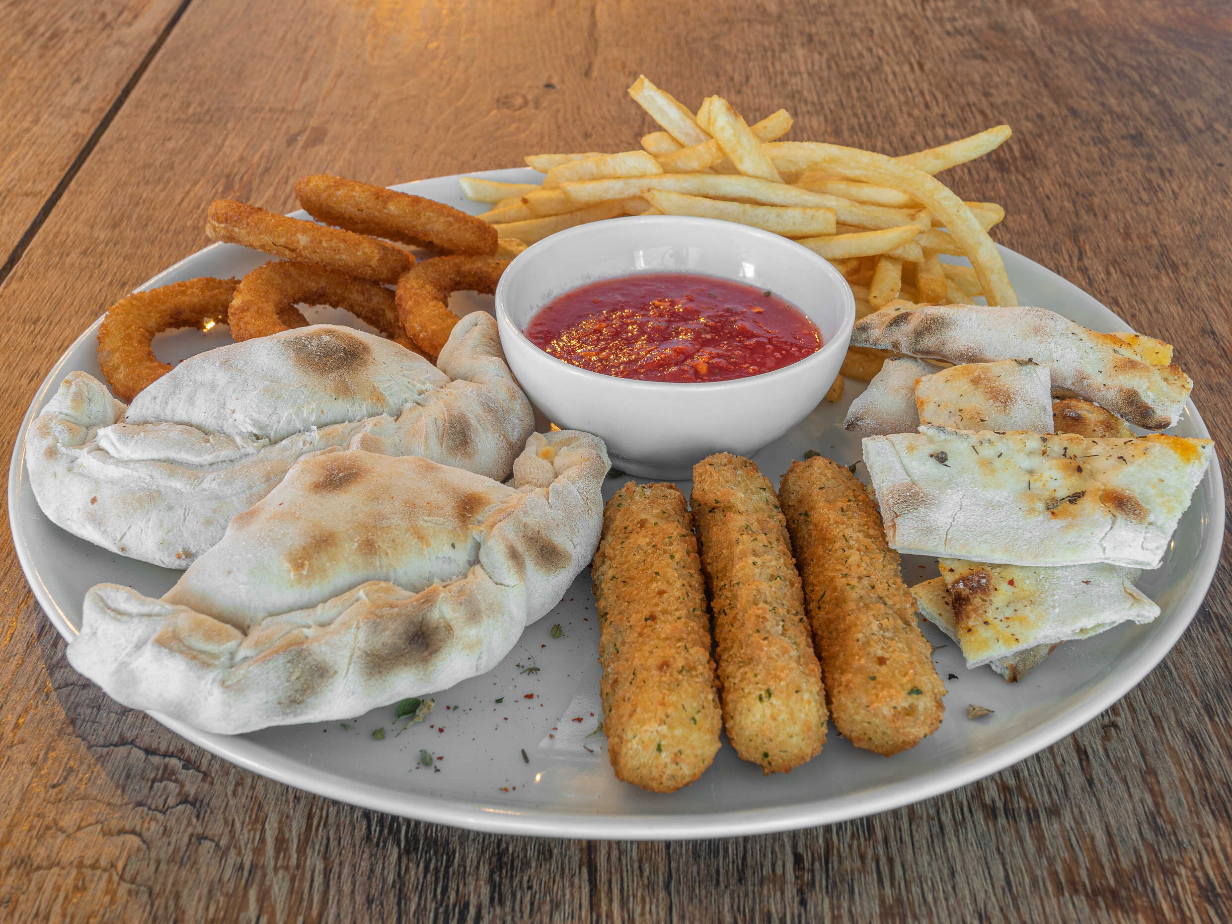 Plato surtido con dedos de queso, papas a la francesa, mini empanadas rellenas, aros de cebolla y focaccia artesanal, acompañado con salsas de la casa.