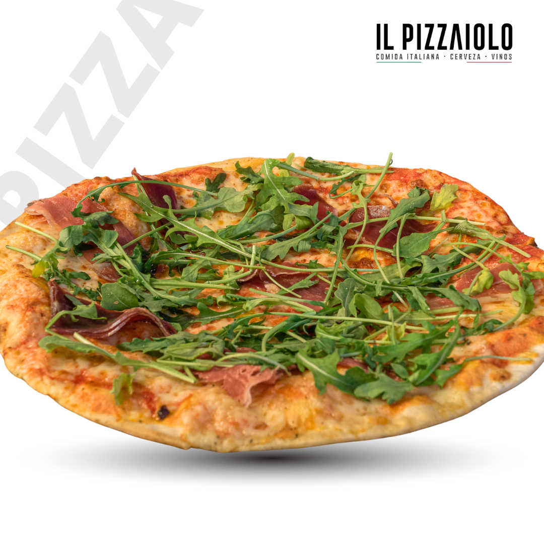 Salsa, queso mozzarella, jamón serrano y arúgula.