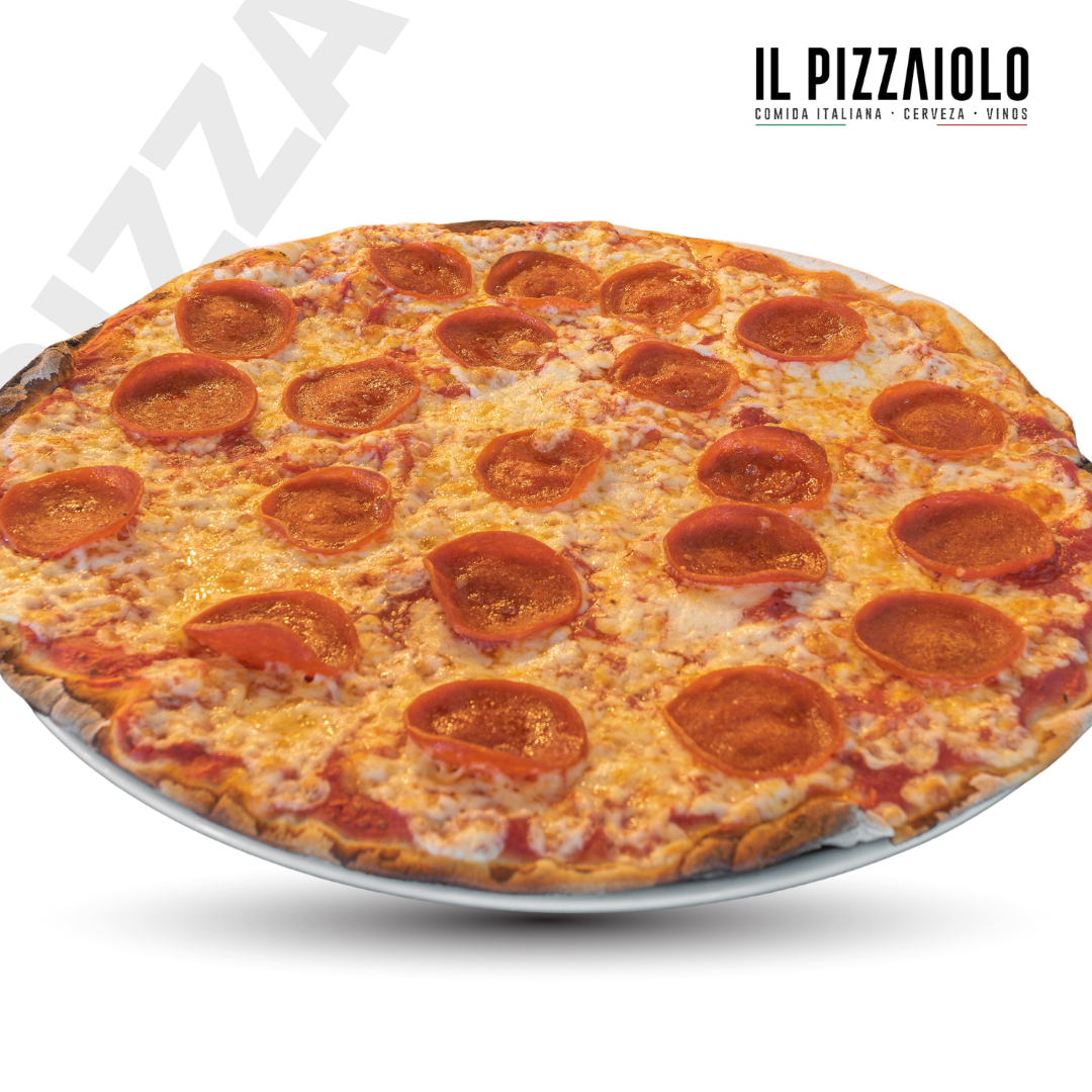 Salsa, queso mozzarella y pepperoni. Pizza de 33 cm de masa delgada al estilo artesanal horneadas a la leña.