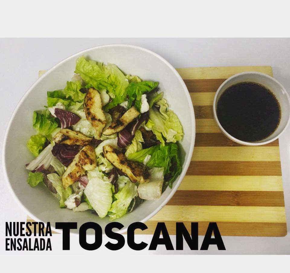 Lechuga, tomates deshidratados, cubitos de mozzarella, almendras fileteadas, pollo y aderezo miel mostaza.