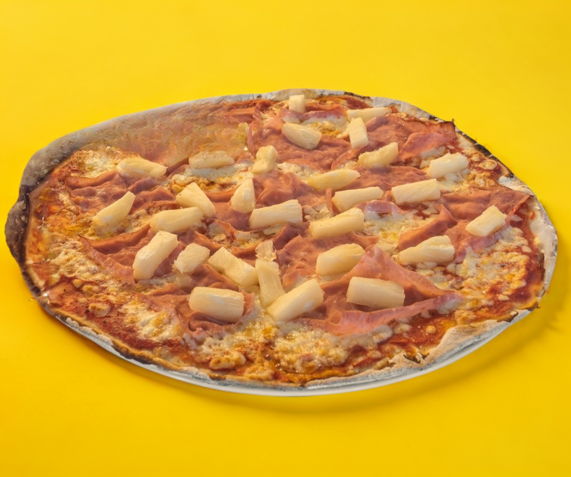 Pizza con salsa, queso, jamón y piña en trozos. Pizzas de 33cm artesanales hechas en horno a la leña.