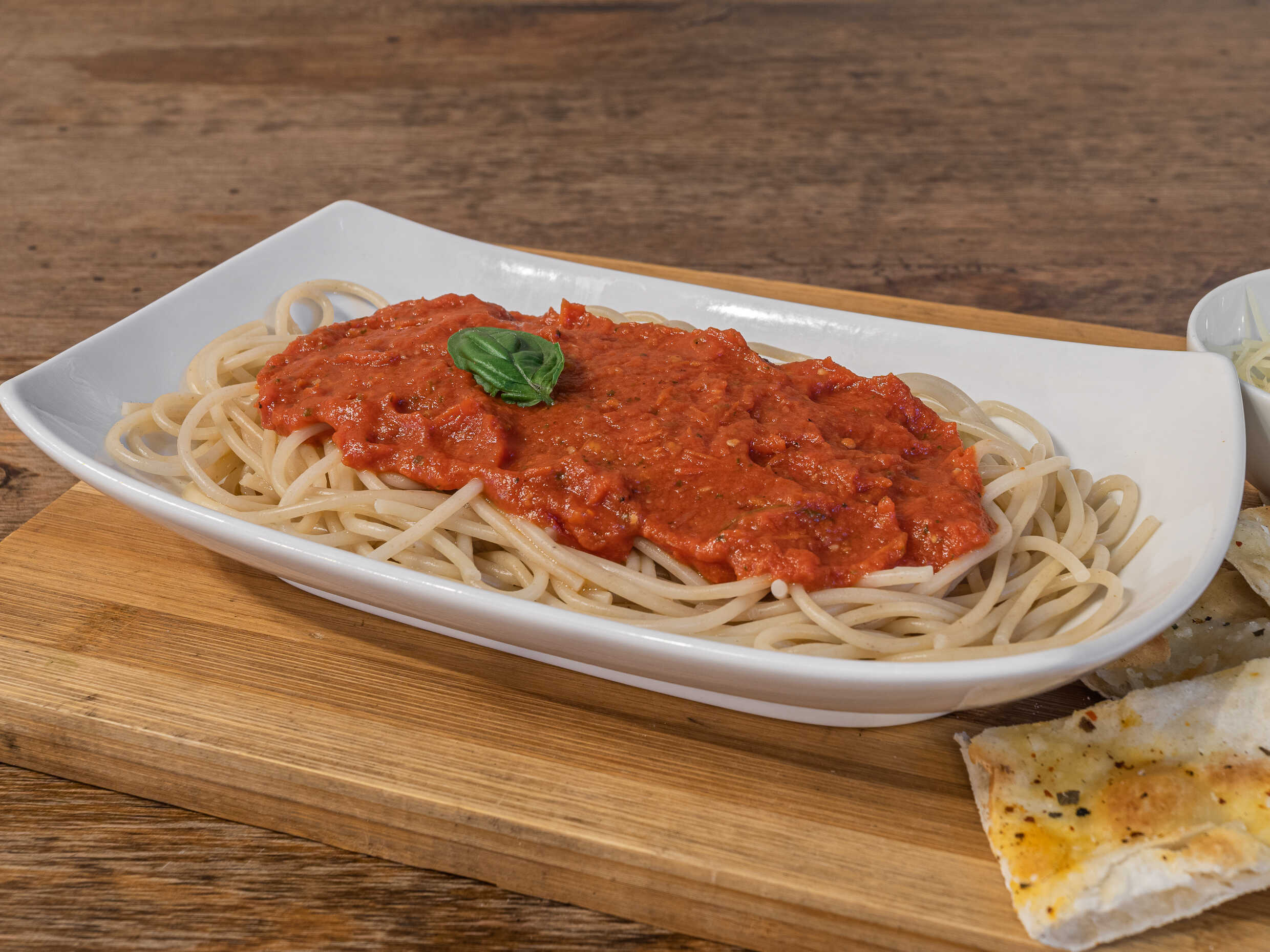 Pasta larga con salsa a base de jitomate artesanal picante con un toque de chile molido acompañada de pan artesanal y queso parmesano.