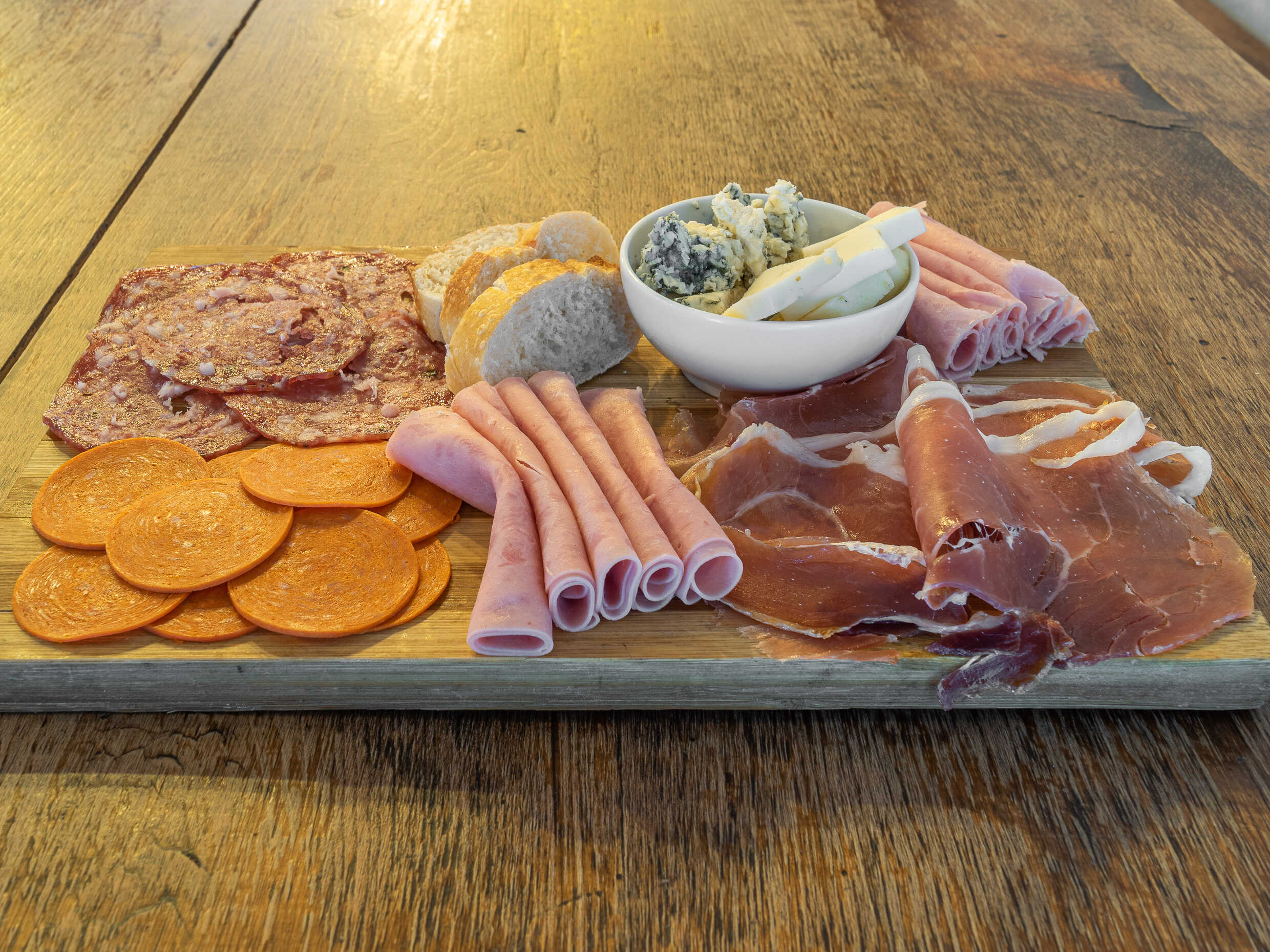 Plato surtido de salami, jamón serrano, jamón cocido, pepperoni, mixto de quesos, acompañados con pan artesanal.