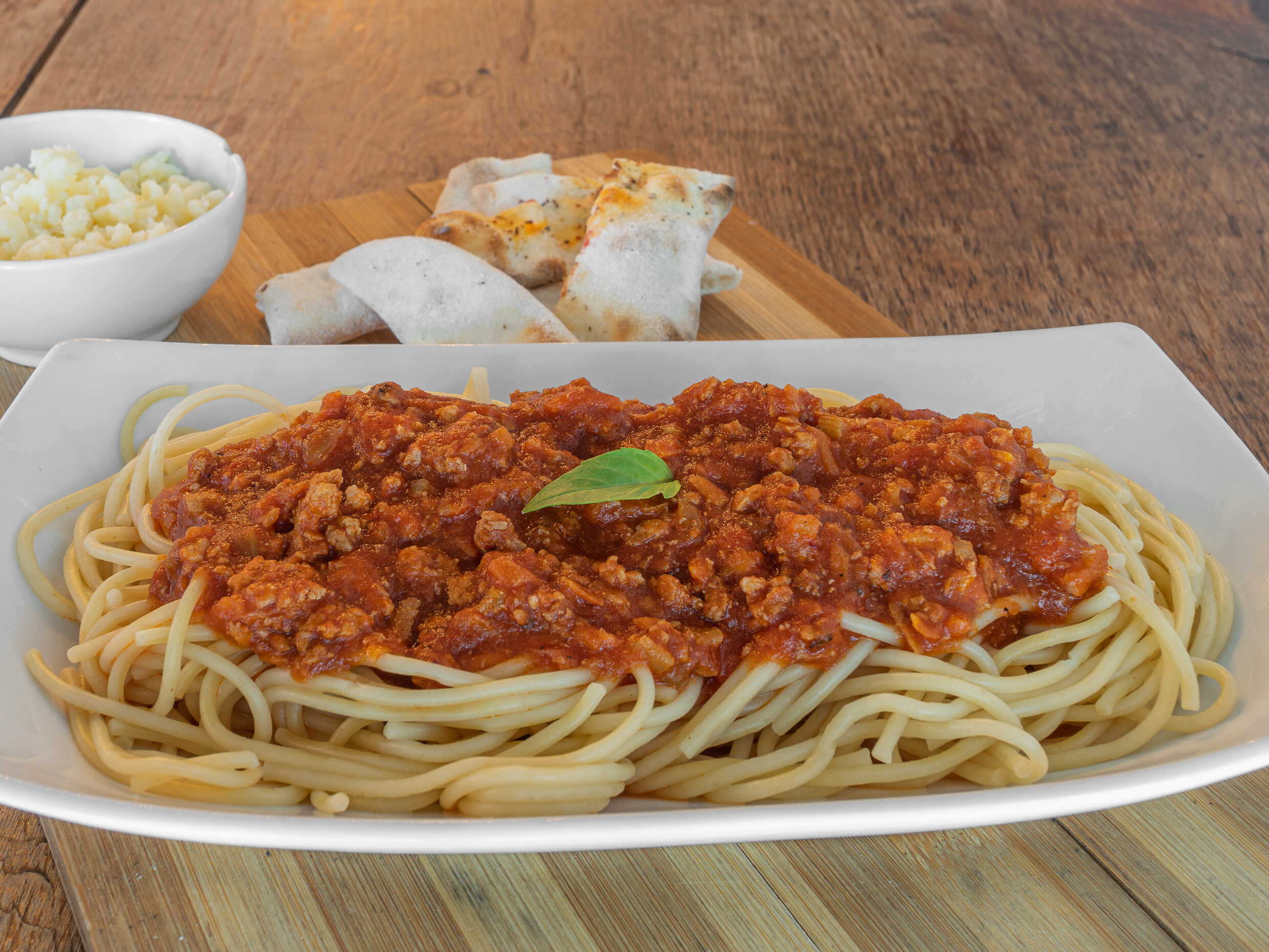 Pasta larga con salsa a base de carne de res molida acompañada de pan y queso parmesano.