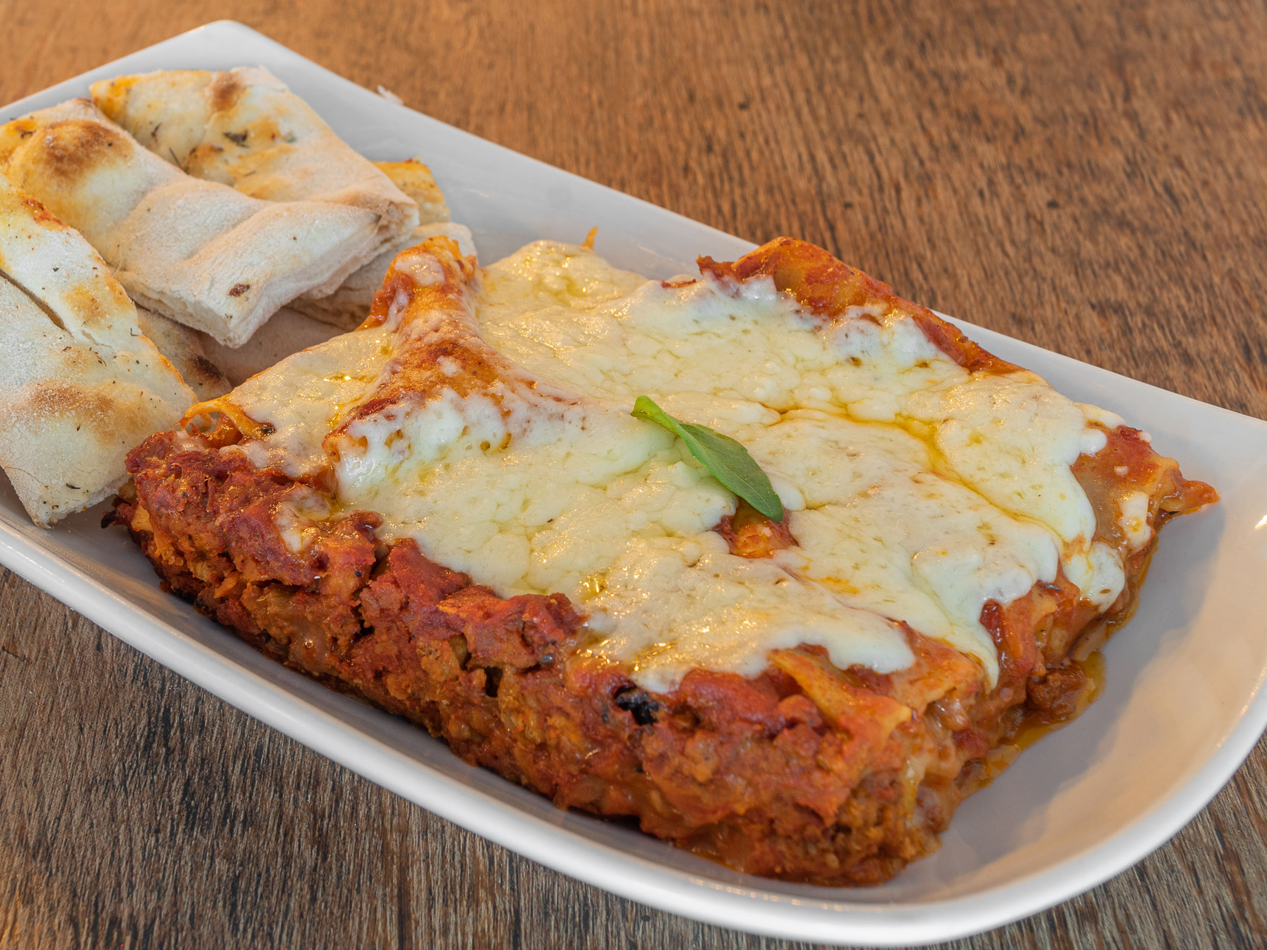 Deliciosa lasaña artesanal con salsa a base de carne de res y con capas de queso mozzarella acompañada de pan artesanal.