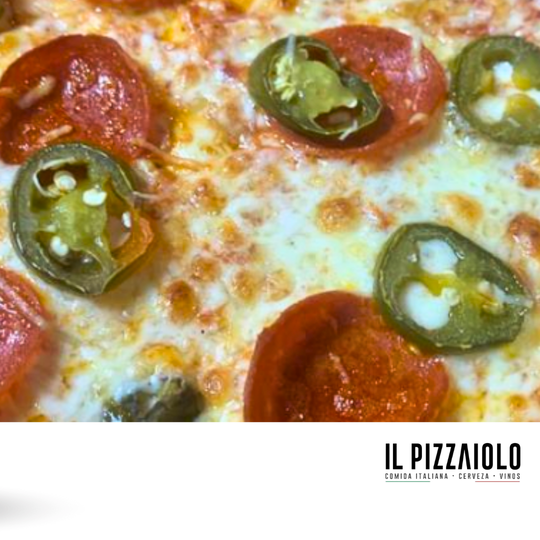 Base de salsa picante, queso mozzarella, pepperoni, jalapeños y una lluvia de queso parmesano. Pizza de 33 cm de masa delgada al estilo artesanal horneadas a la leña.
