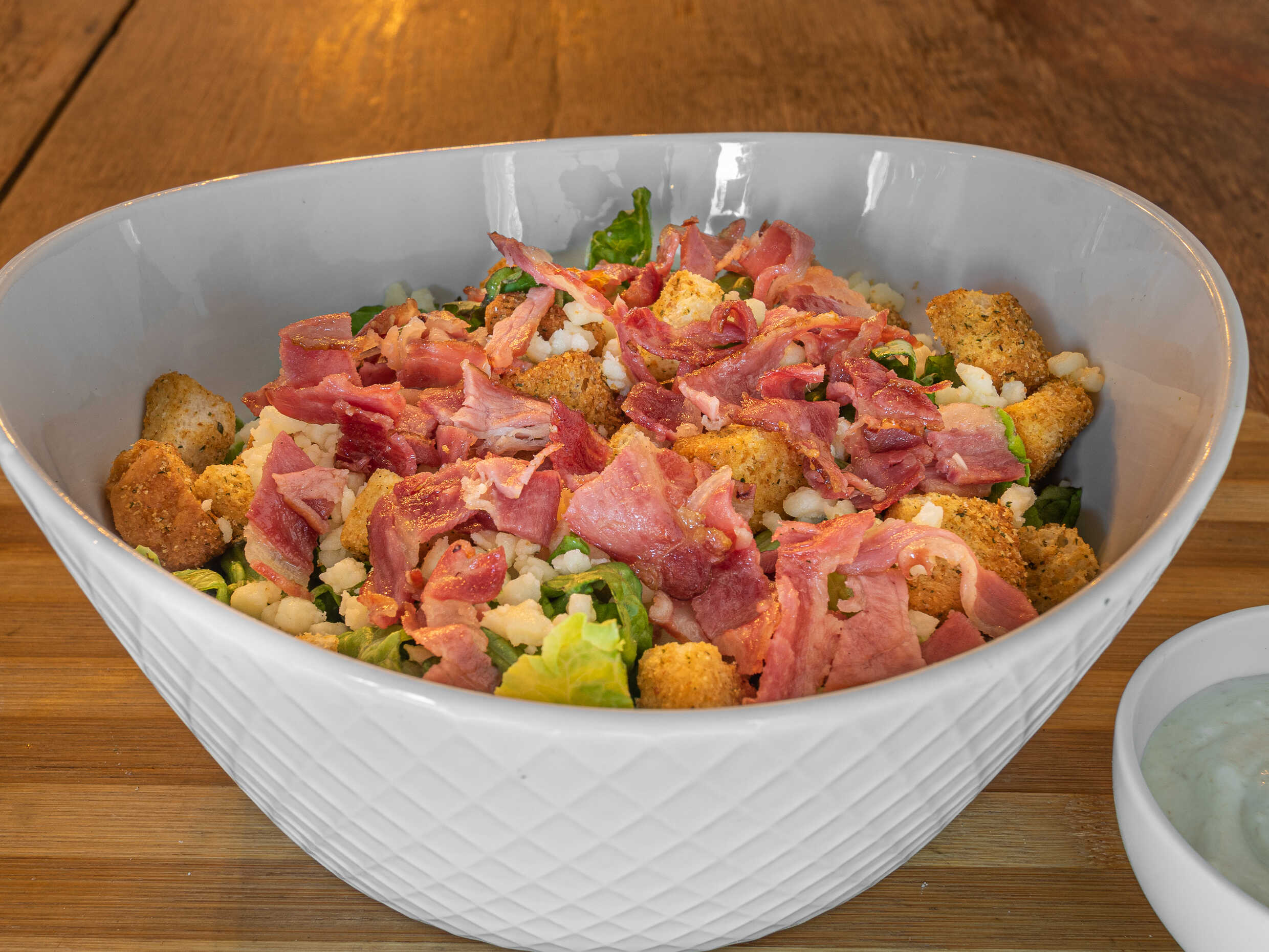 Lechugas, pollo, queso azul roquefort, tocino en trozos vinagreta de la casa.