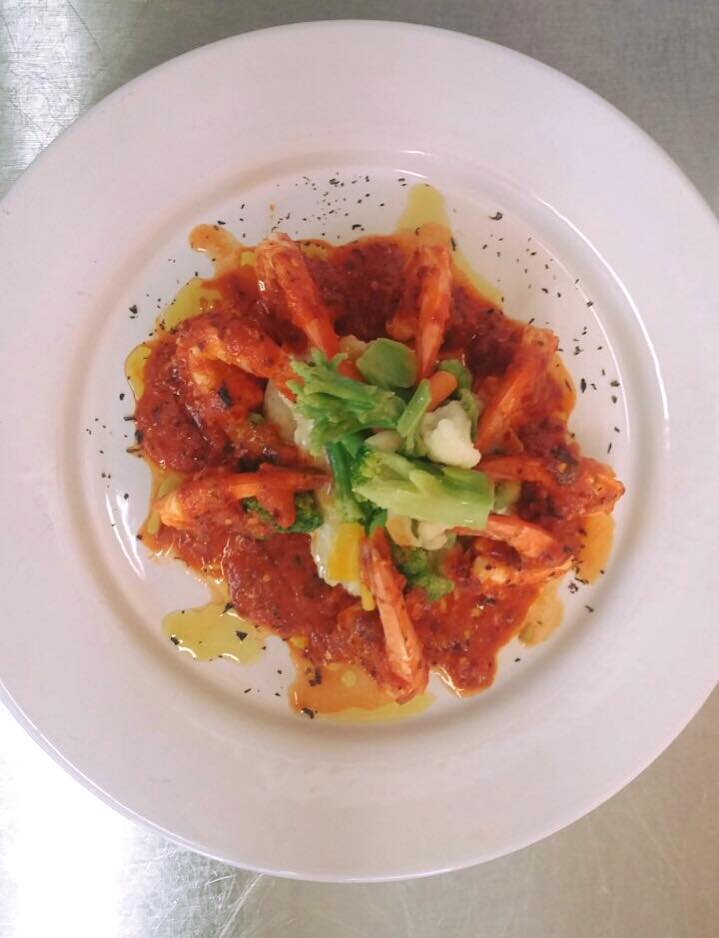 Camarones flameados con brandy, un toque de chile de árbol y guarnición de papa gratinada y verduras al vapor.