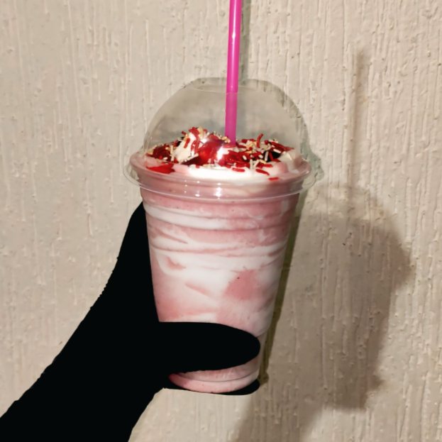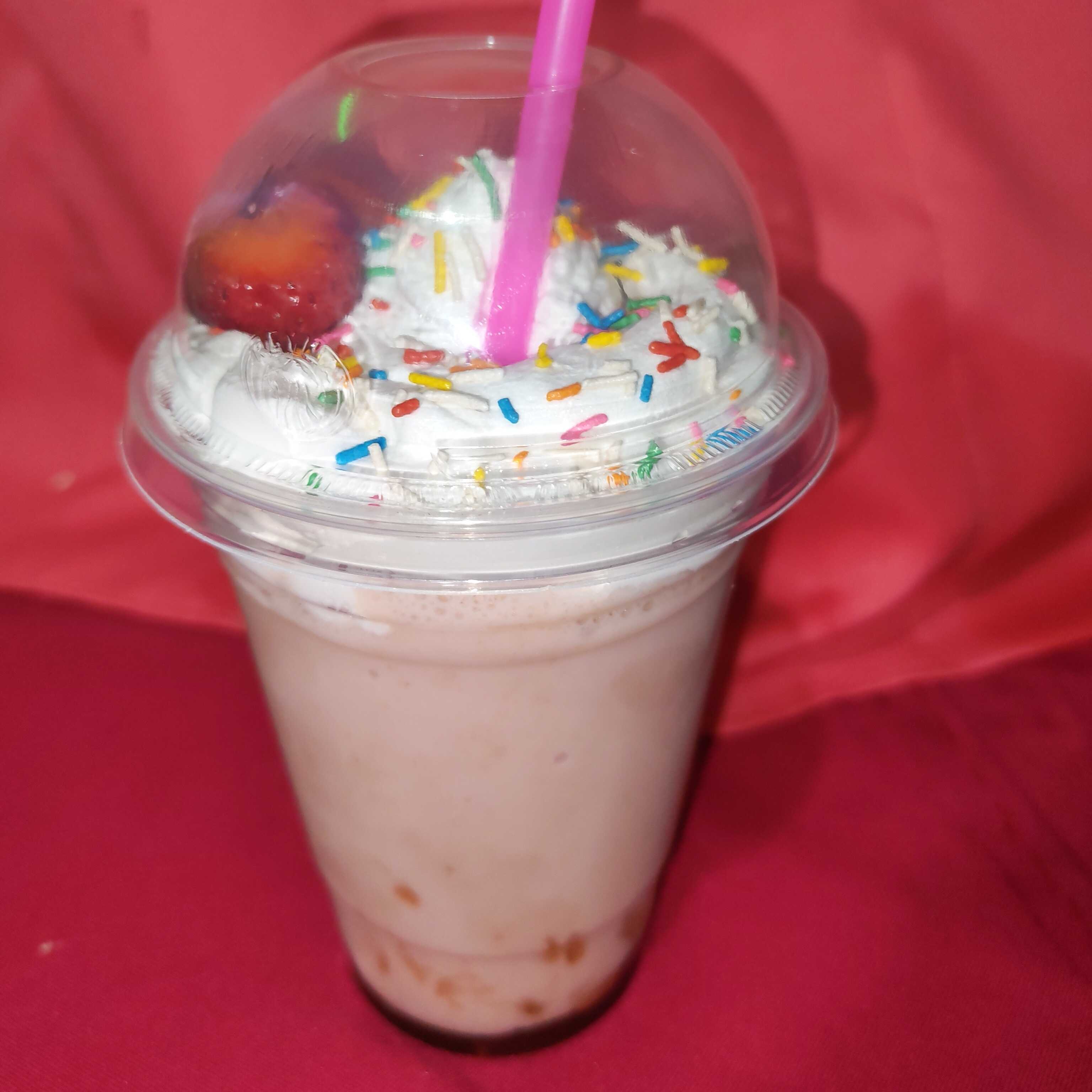 Hecho con fresas frescas, con aderezo de fresa de base, crema batida arriba y chispas de colores