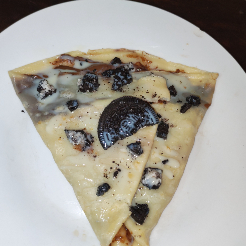 Crepa rellena de crema de avellana y galletas, cubierta de lechera, chispas de chocolate y galletas