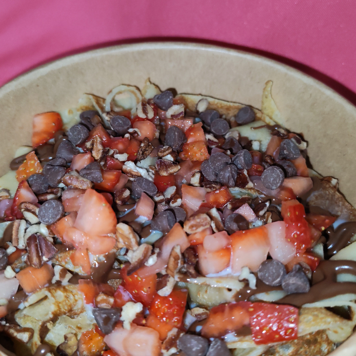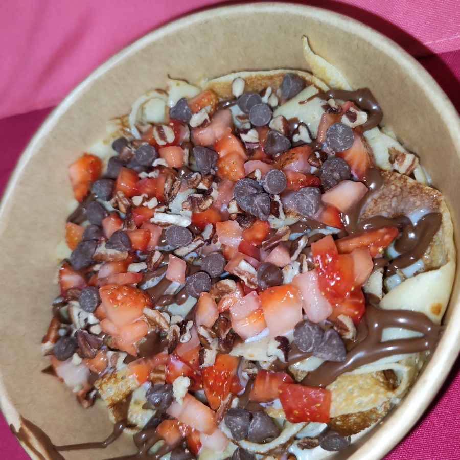 1 Deliciosas crepas dulces cortadas artesanalmente en finas hebras (como spaghetti), bañadas con tu salsa dulce favorita, las fruta y topping de tu elección.