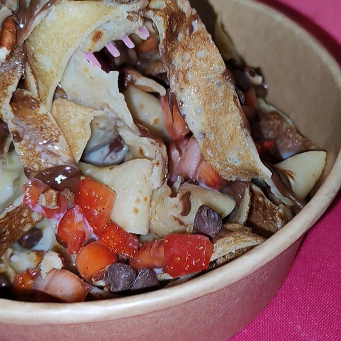 2 Deliciosas crepas dulces cortadas artesanalmente en finas hebras (como spaghetti), bañadas con tu salsa dulce favorita, 2 frutas y el topping de tu elección.