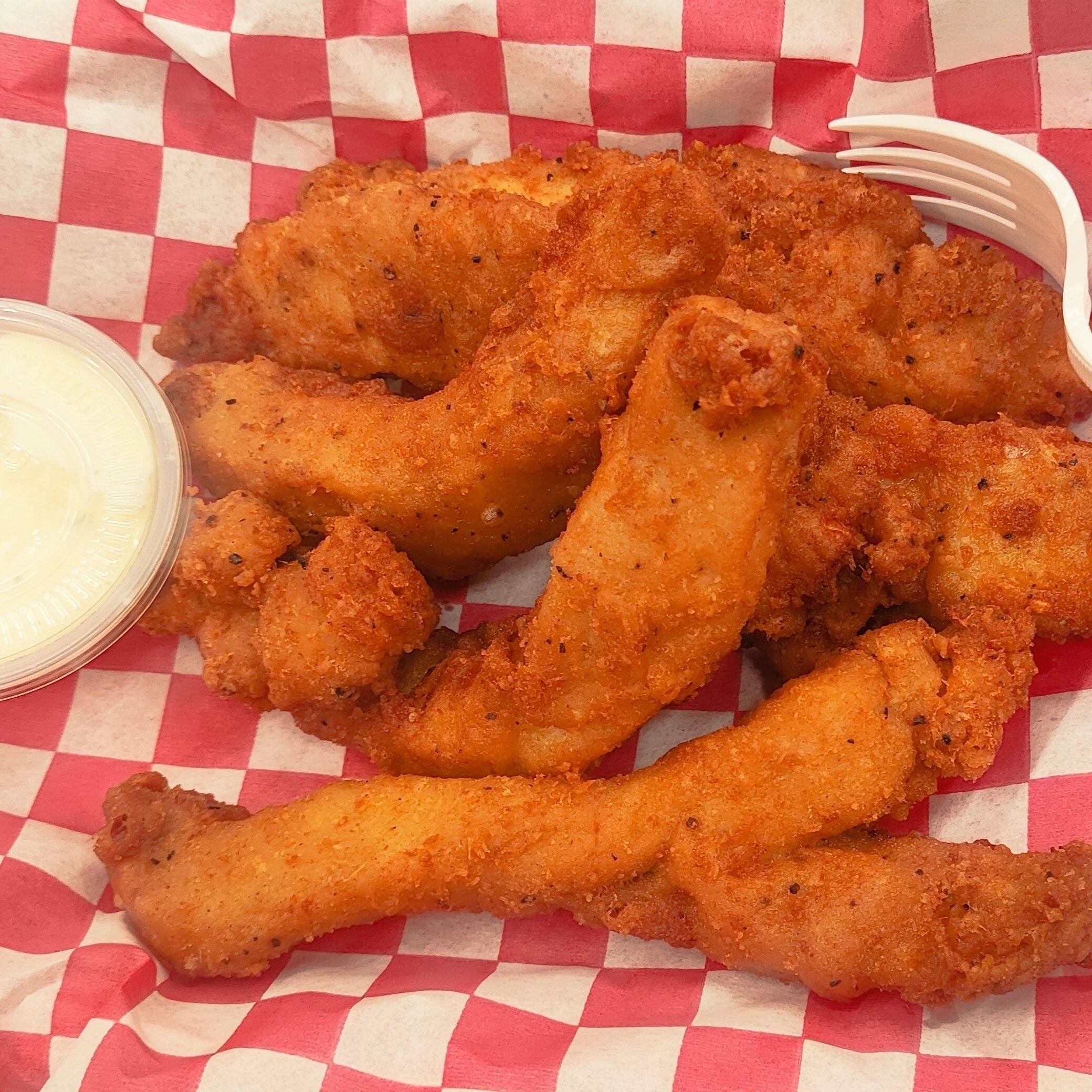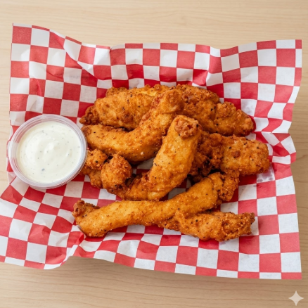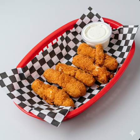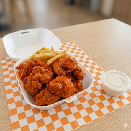 300 g De bonelles con salsa de tu elección, 150 g de papas fritas acompañadas de aderezo ranch.