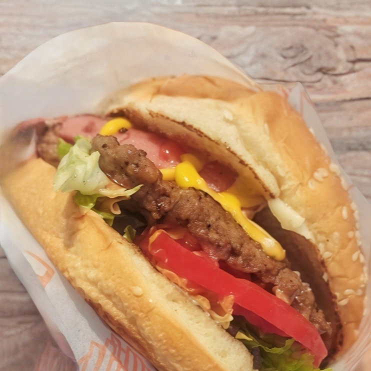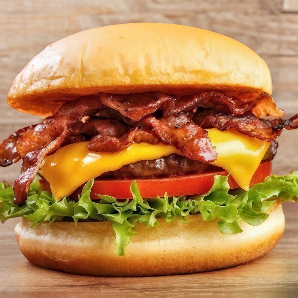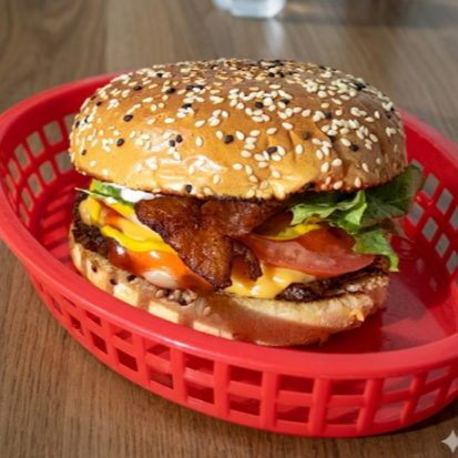 Pan tipo parrillero, carne de 115 g, queso amarillo tipo americano, tocino ,jitomate, cebolla, lechuga y aderezos.