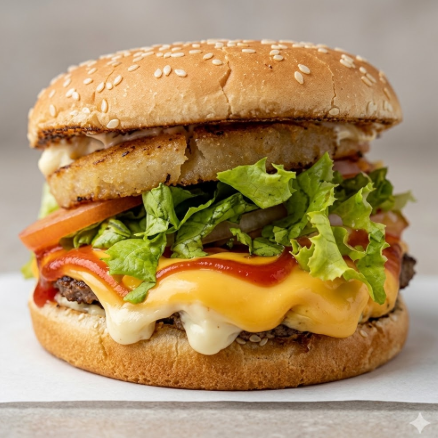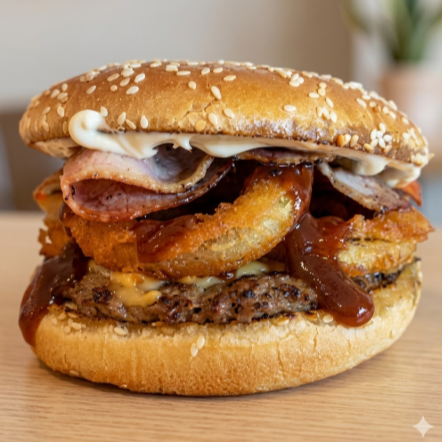 Pan parrillero, carne de 115 g , queso amarillo tipo americano, 5 aros de cebolla, tocino, BBQ y mayonesa.