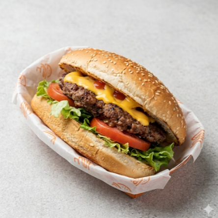Pan tipo parrillero, dos carnes de 115 gr, queso amarillo tipo americano, jitomate , cebolla , lechuga , chiles en vinagre y aderezos.