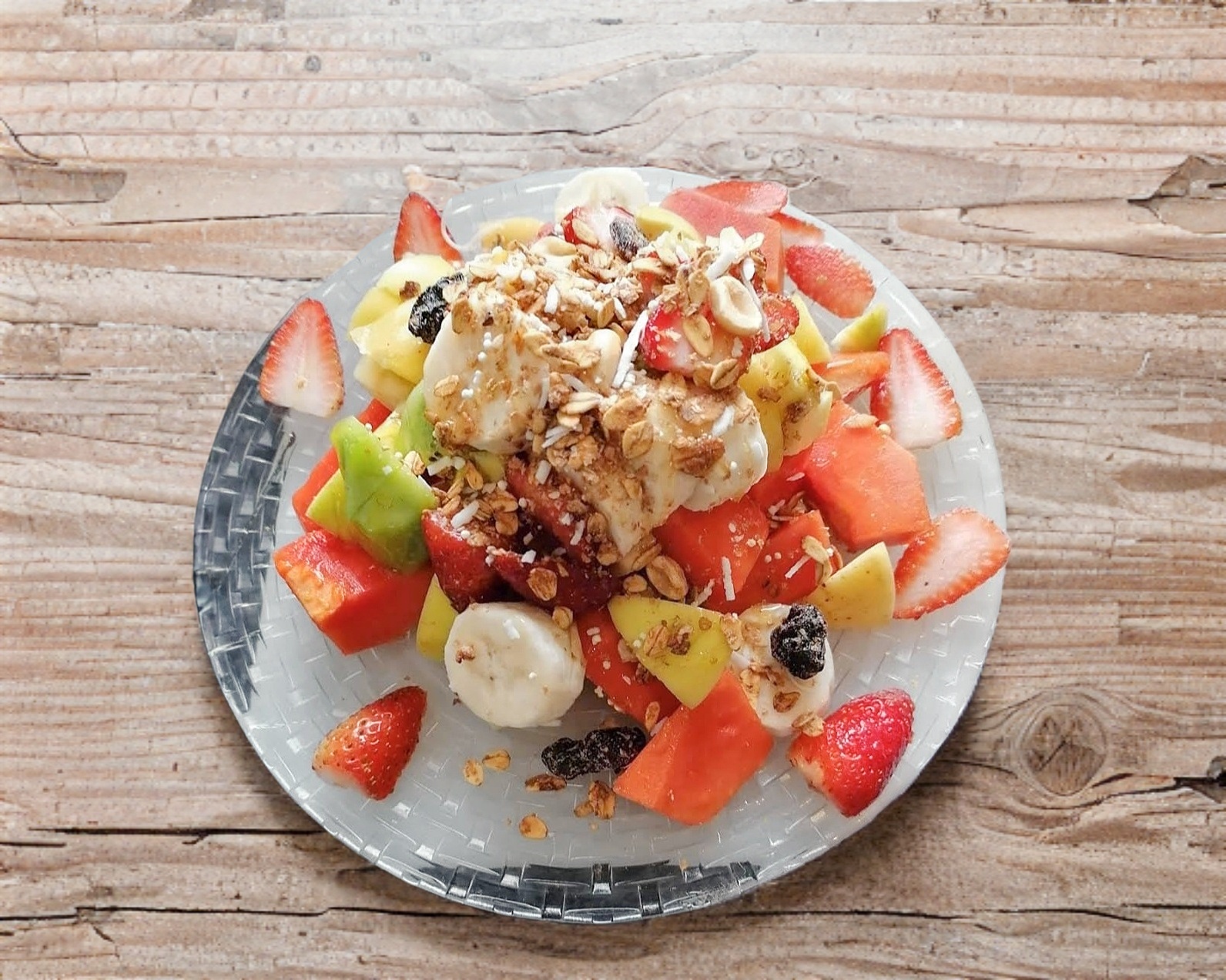 Cóctel de frutas, Papaya, melón, manzana, guayaba, mango, kiwi, fresa y granola. Elije entre miel o yogurth