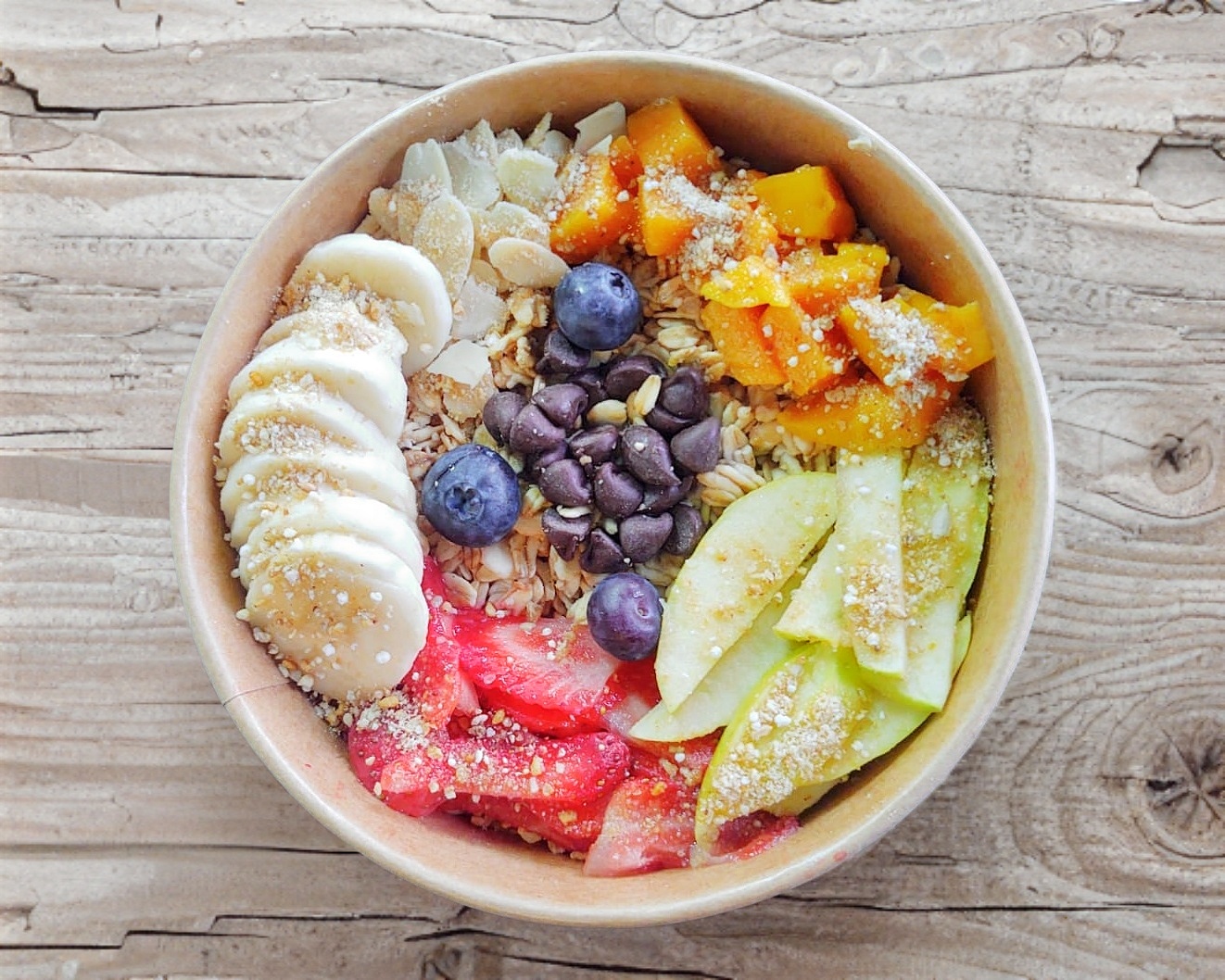 Avena Hidratada Platano,fresa, pera, Manzana,Mango Chispas Chocolate, Almendra Fileteada,Ciruela pasa Nuez y Arándanos