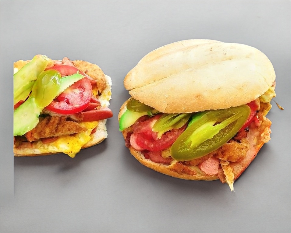 Milanesa, salchicha, jamón, pierna, chorizo, queso panela, aguacate, jitomate, chiles en vinagre y mayonesa.