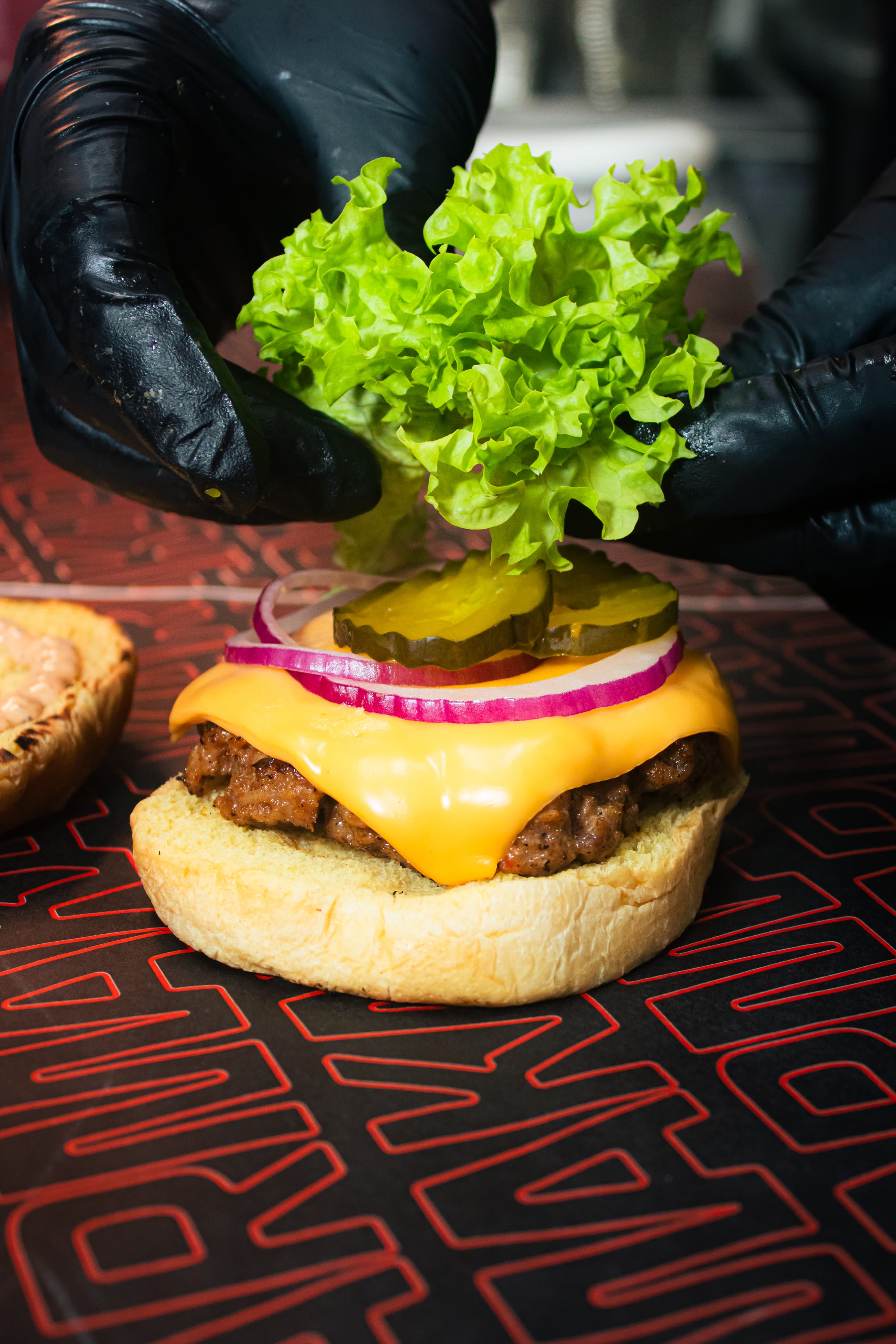 125 g De carne, queso americano, salsa Karma, cebolla morada, lechuga y pepinillos.