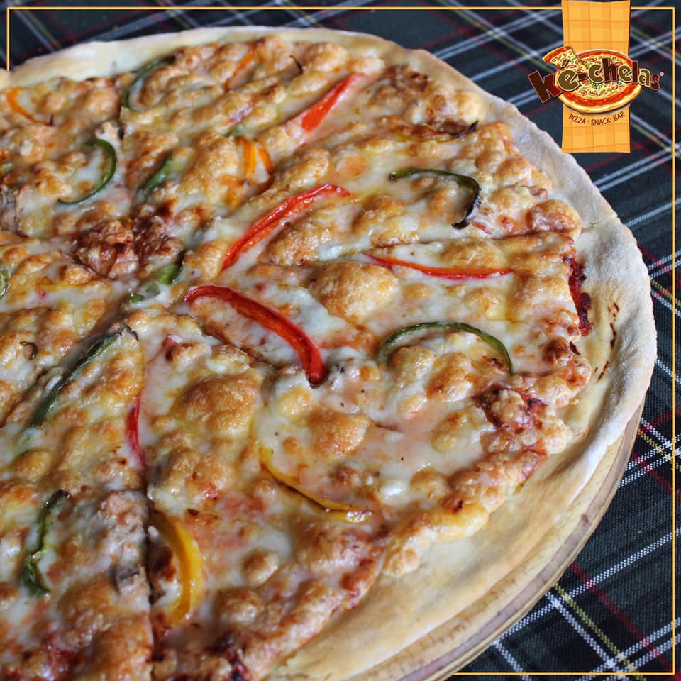 Con trozos de pollo BBQ, pimiento, cebolla morada y un toque de cilantro.