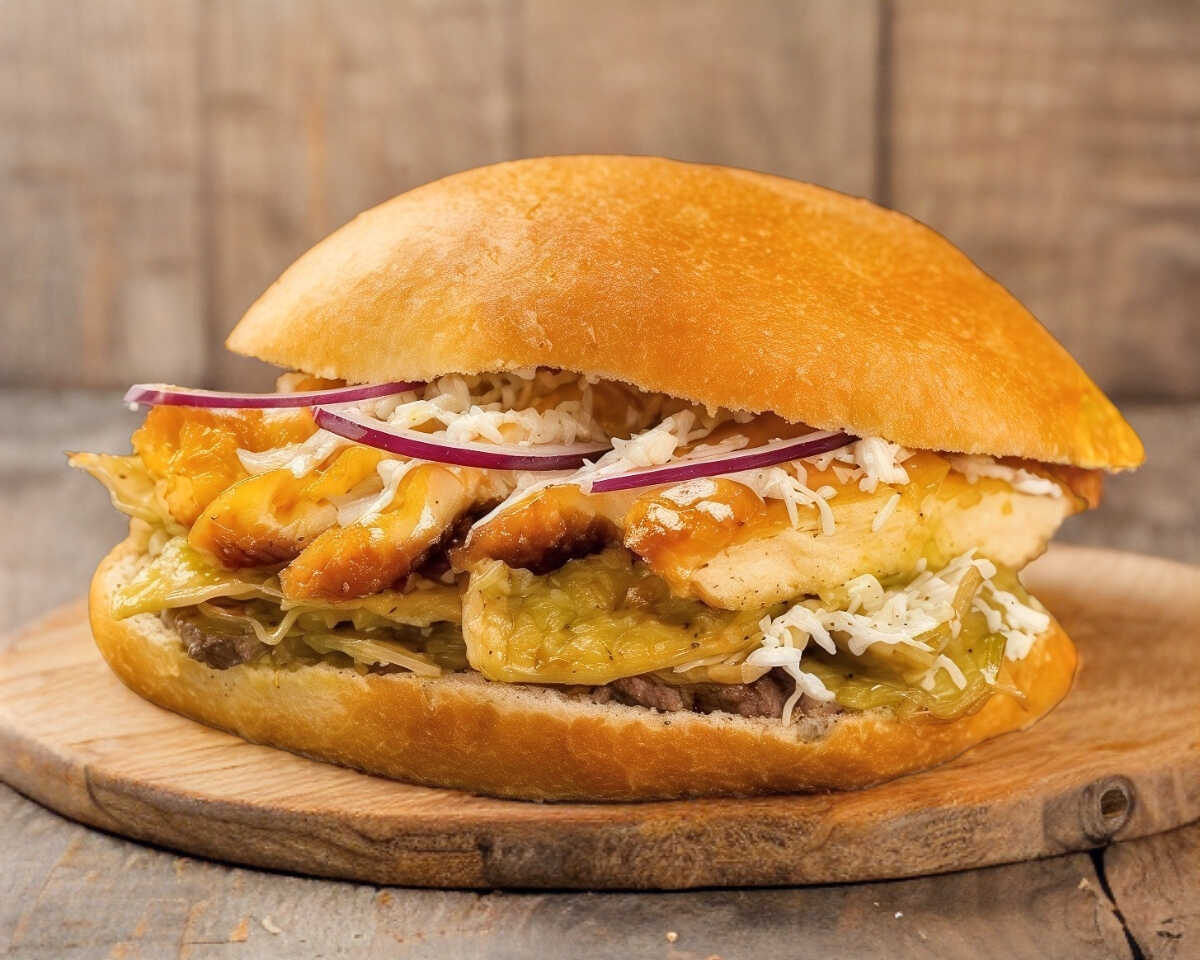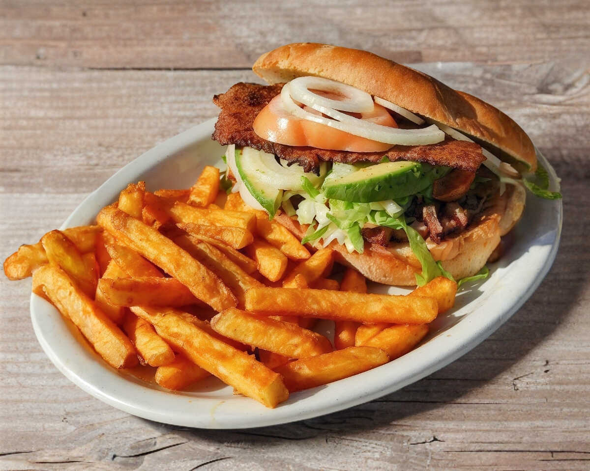 Jugosa torta de milanesa de pollo, mayonesa, aguacate, jitomate, cebolla, cheddar derretido; acompañada de papas a la francesa.
