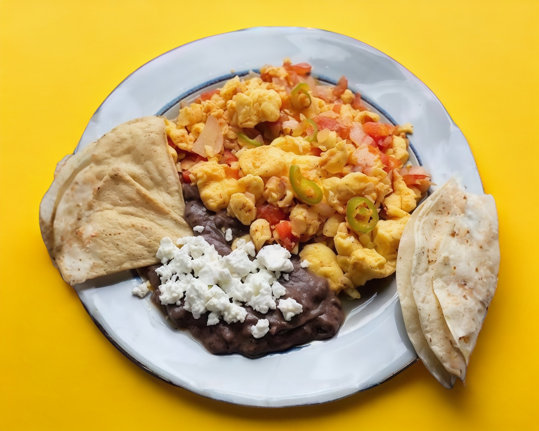 3 huevos revueltos al propio estilo mexicano acompañados de unos deliciosos frijoles de su eleccion, aguacate, totopos y queso panela.Incluye: 1 taza de cafe de su eleccion.