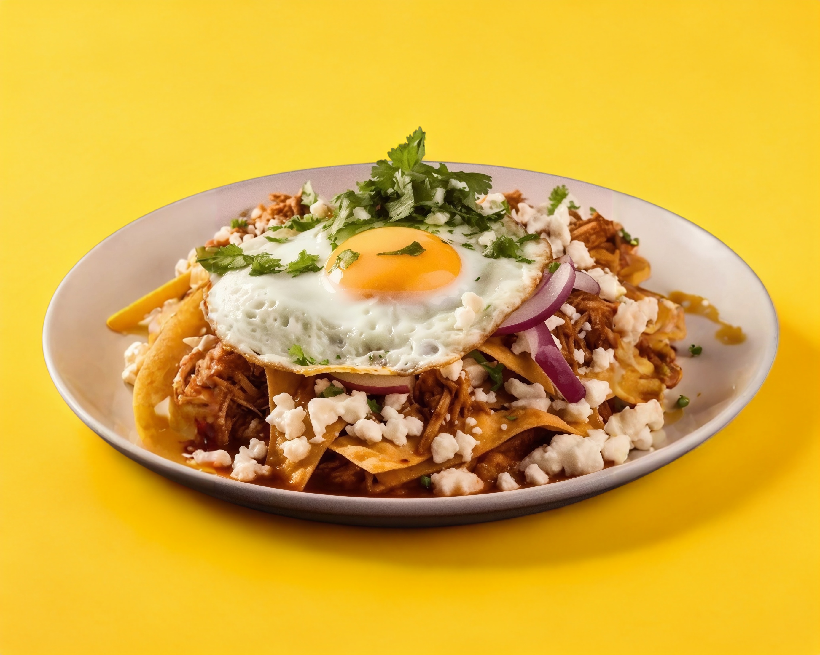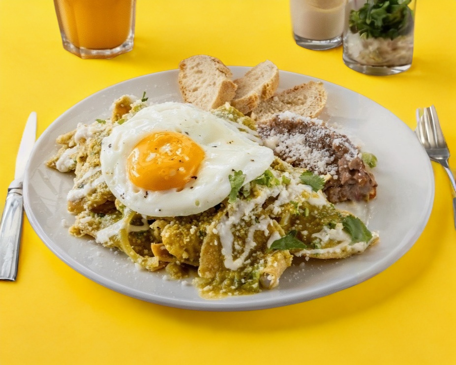 Un suculento platillo de chilaquiles en salsa verde o roja con 1 huevo estrellado, pollo, crema, queso fresco y frijoles fritos. Incluye: 1 taza de cafe de su eleccion.