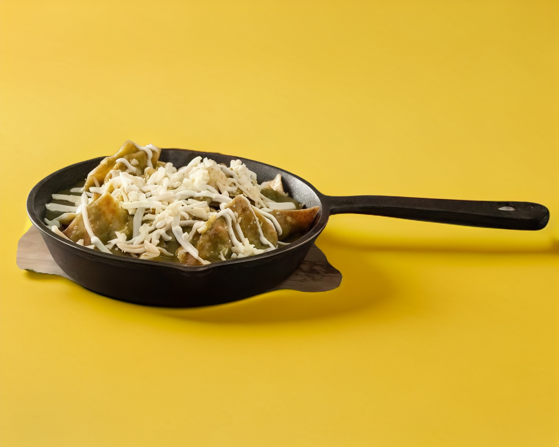 Sabrosos y jugosos chilaquiles en salsa roja o verde con pollo, crema, queso fresco y frijoles fritos. Incluye: 1 taza de cafe de su eleccion.