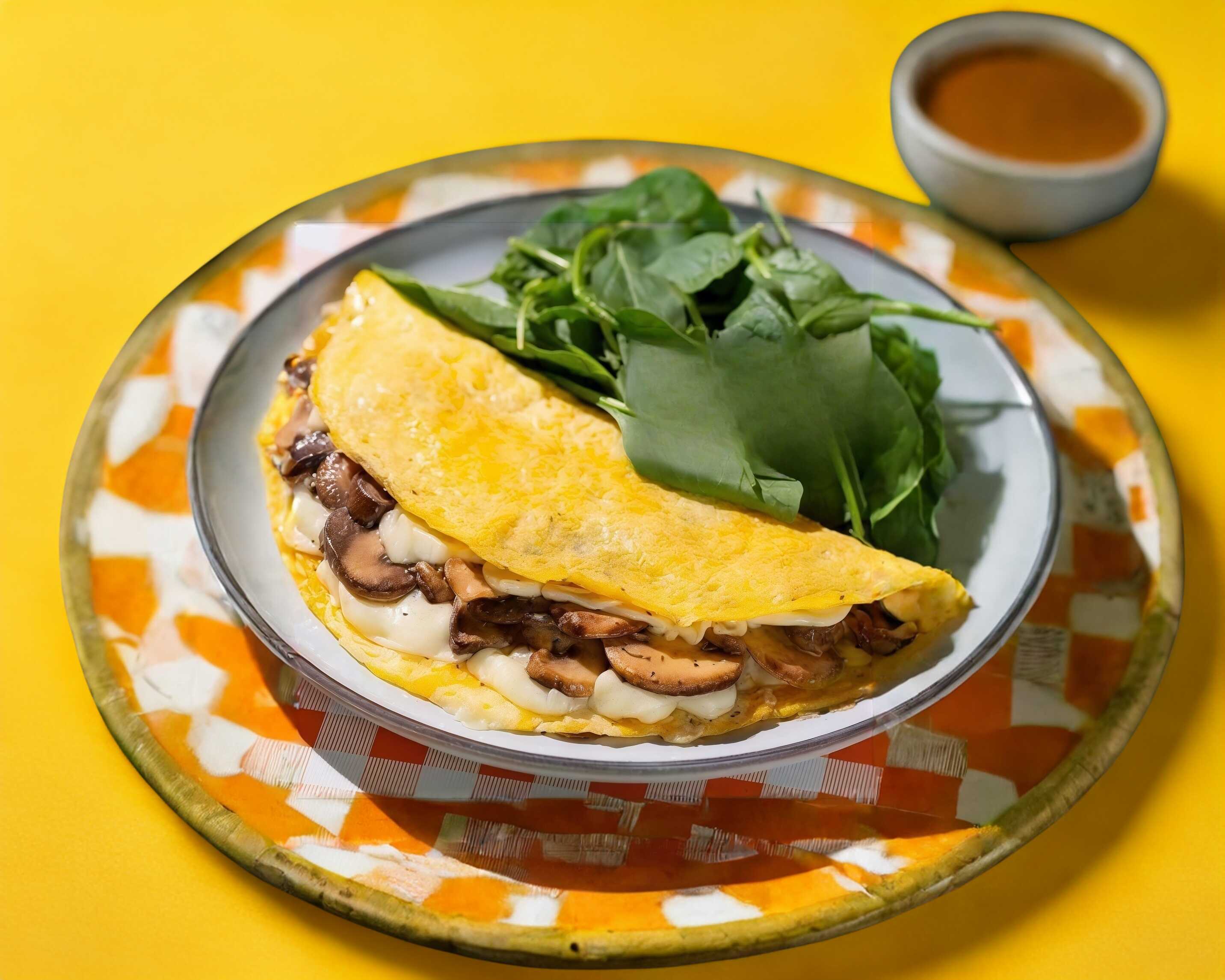 Suculento omelette de 3 huevos con champiñones; acompañado de una fresca ensalada de espinaca, tomate cherry y pico de gallo. Incluye: 1 taza de cafe de su eleccion.